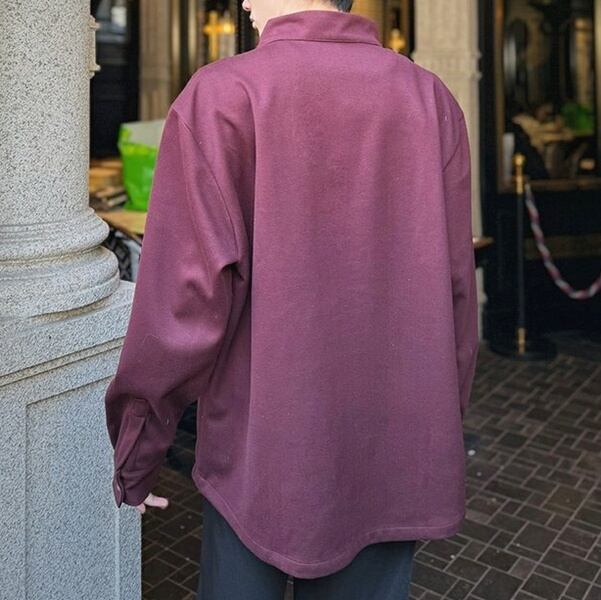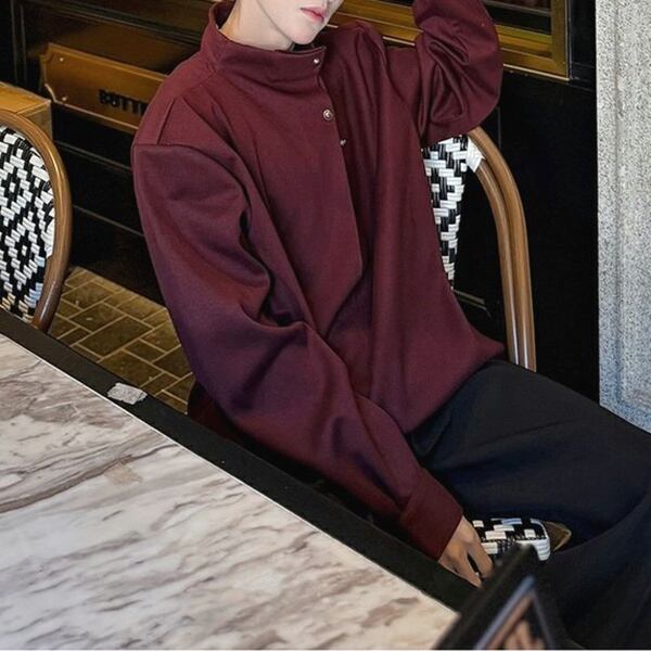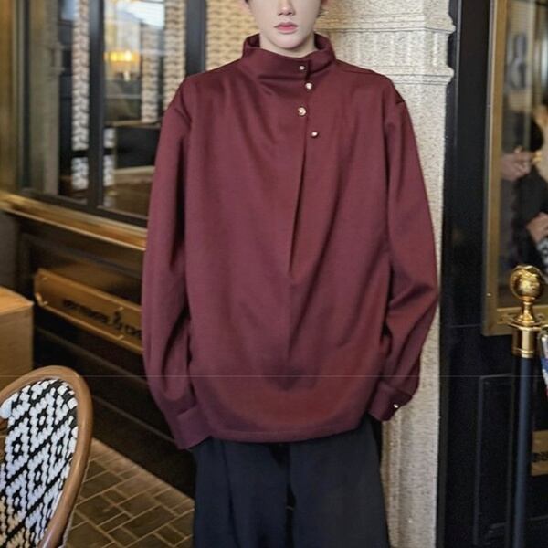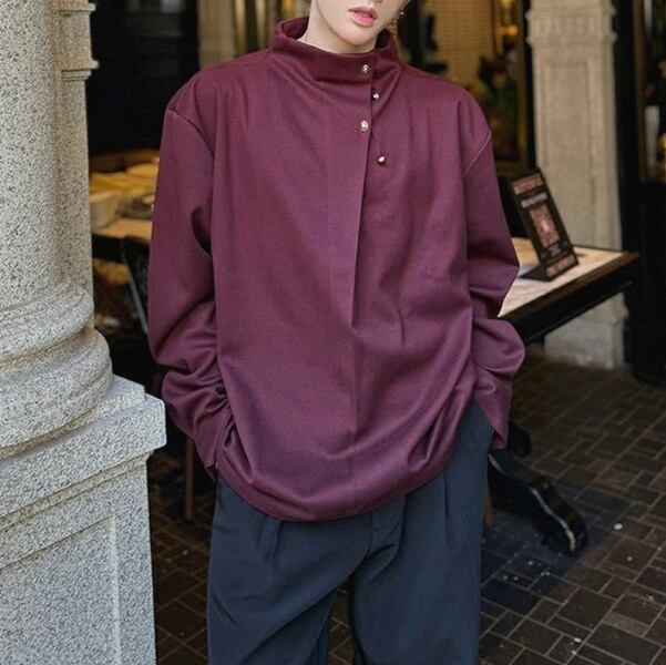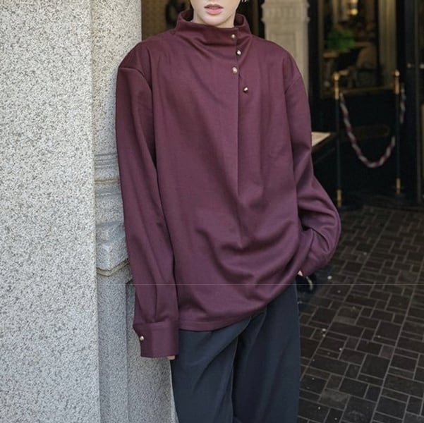 ハイネックサイドボタンロングスリーブワインレッドトップス(ruf_02058)