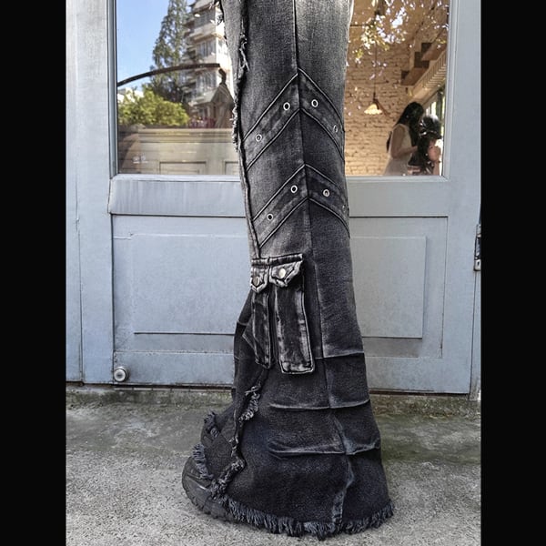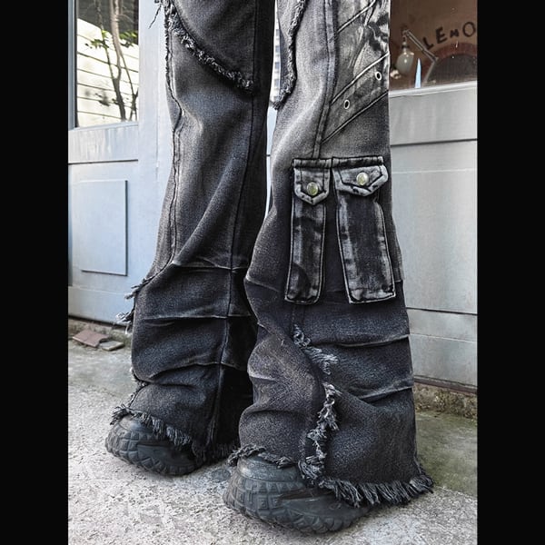 マルチポケットグランジウォッシュドブラックフレアデニム(ruf_02346)