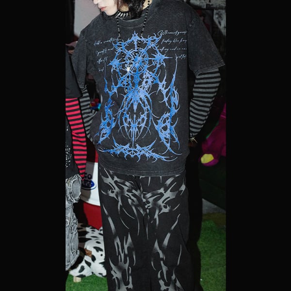 ブラックトーテムブルーグラフィックショートスリーブウォッシュドブラックカットソー(ruf_02357)