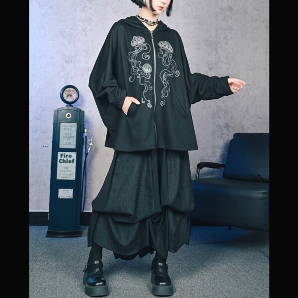 ◆【RECOMMEND】ドルマンスリーブ海月グラフィックジップアップリラックスパーカー(ruf_02412)