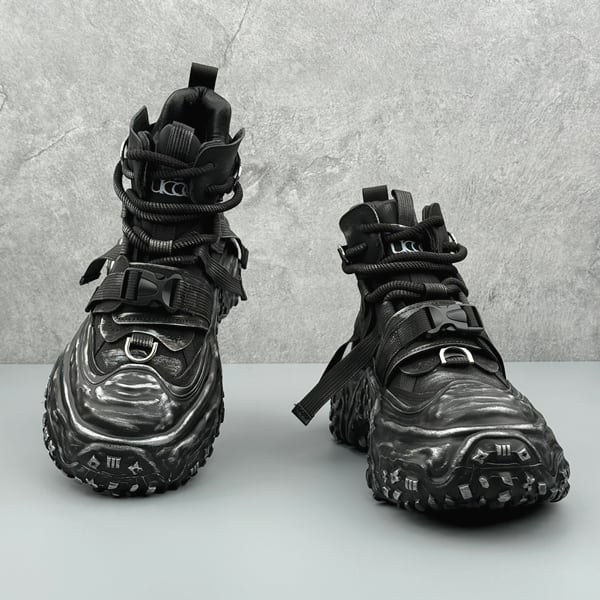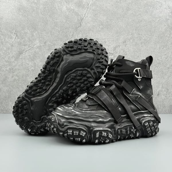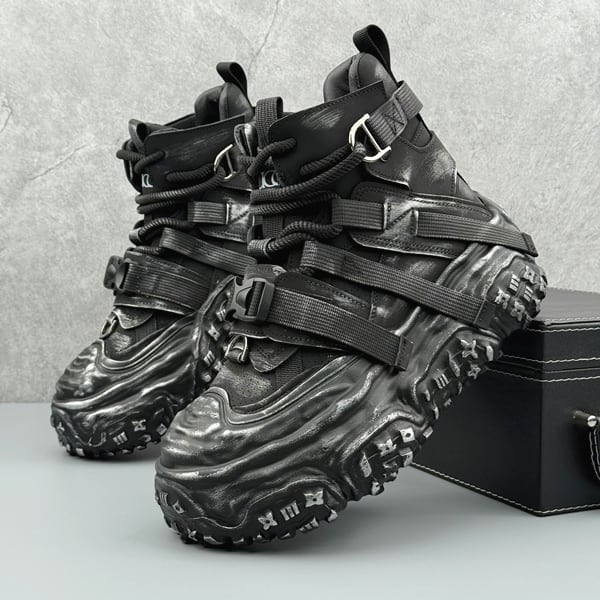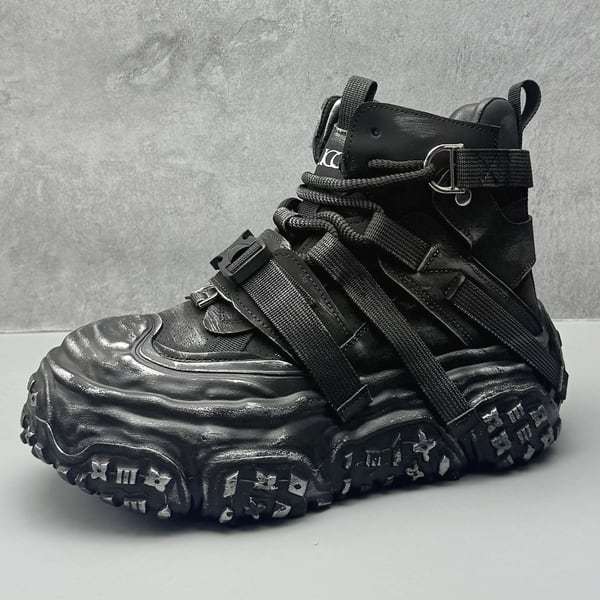 ボリュームクラックソールレースアップハイカットグランジブラックオールブラックストラップシューズ(ruf_02422)