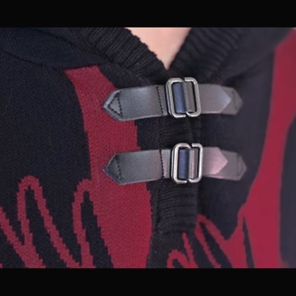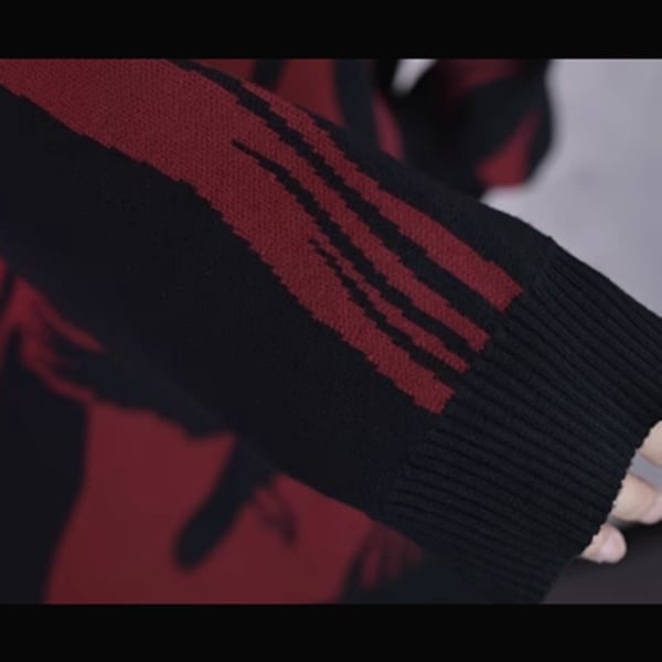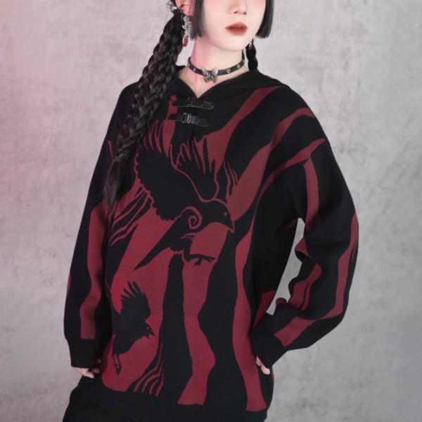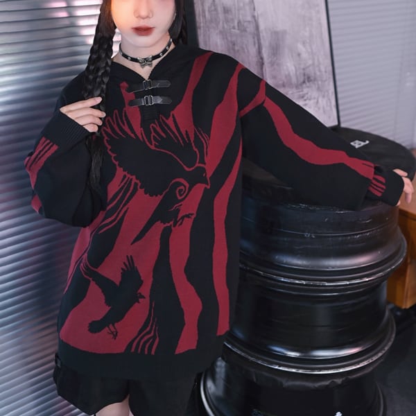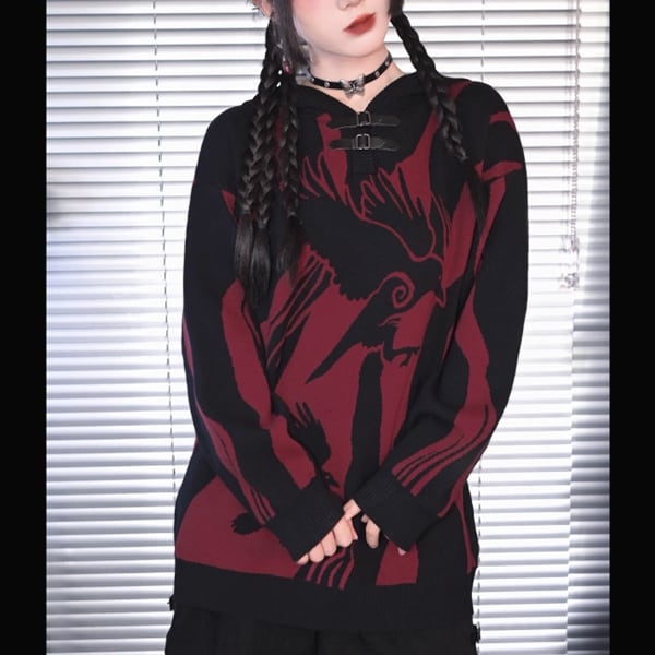◆【RECOMMEND】鴉グラフィックレッドブラックフーディダブルストラッププルオーバーニット(ruf_02492)