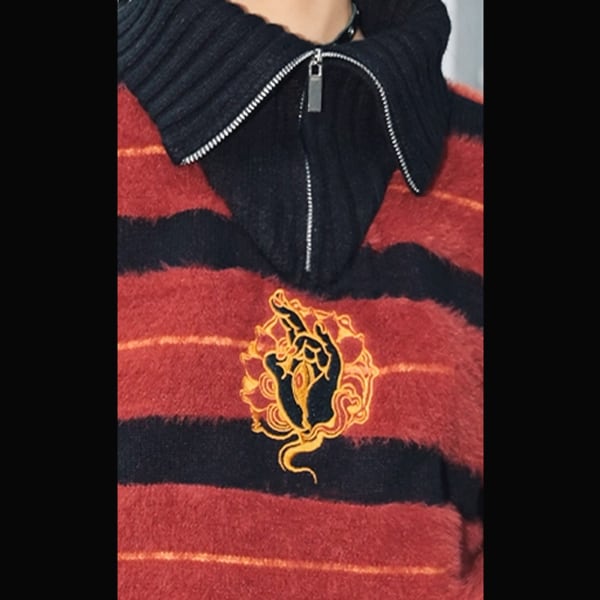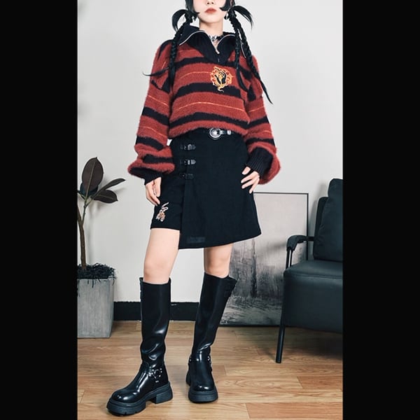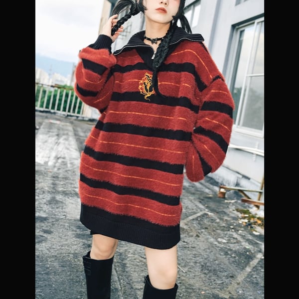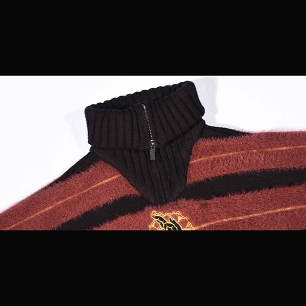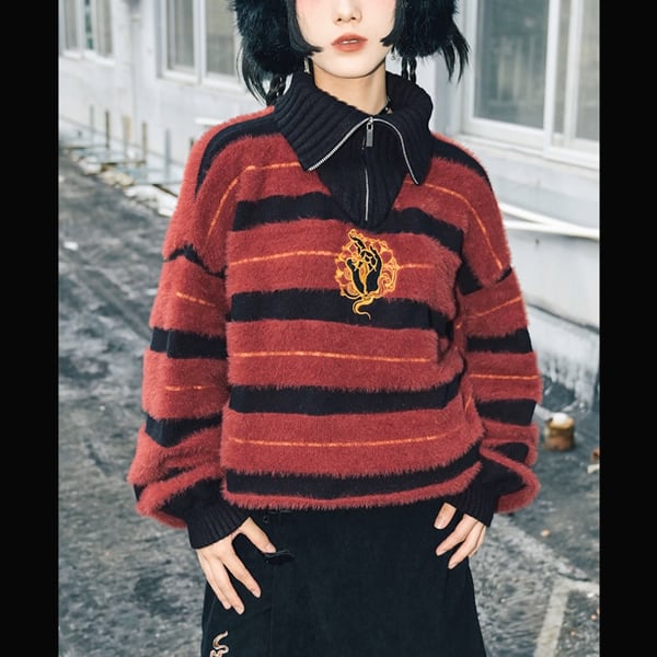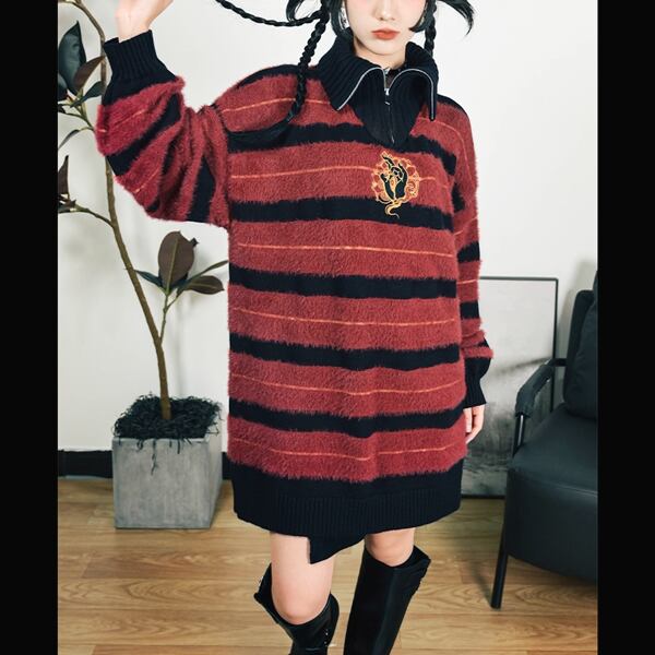 ハーフジップハイネックブラックボーダー刺繍リラックスニット(ruf_02497)