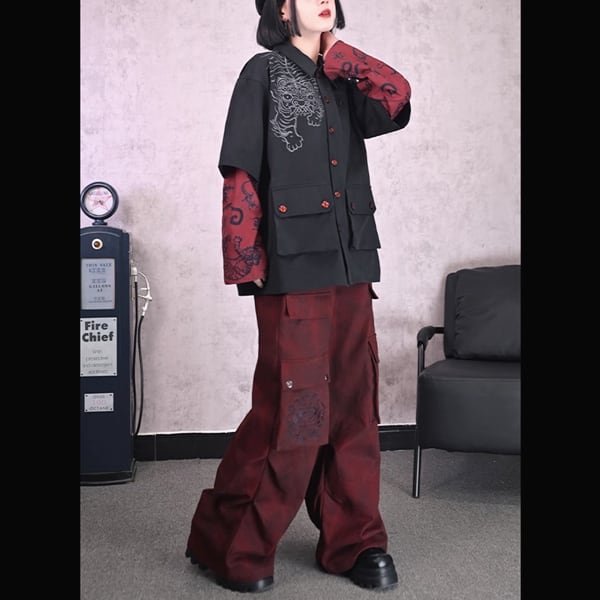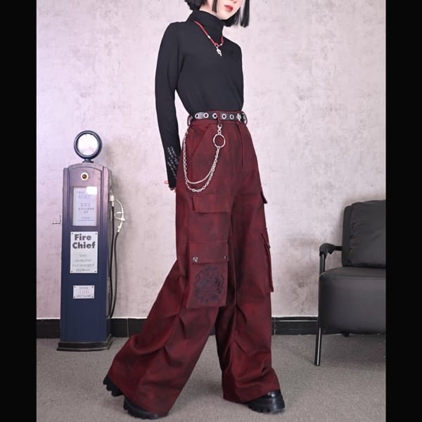 五毒刺繍ダイダイワインレッドサイドポケットワイドパンツ(ruf_02503)