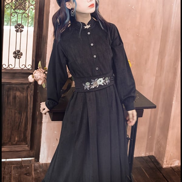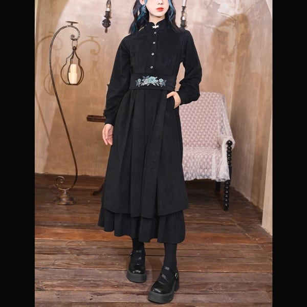 スタンドカラーティアード刺繍ベルトリボンボタンワンピース(ruf_02583)