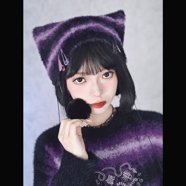ブラックパープルボーダーボンボン猫キャップ(ruf_02588)