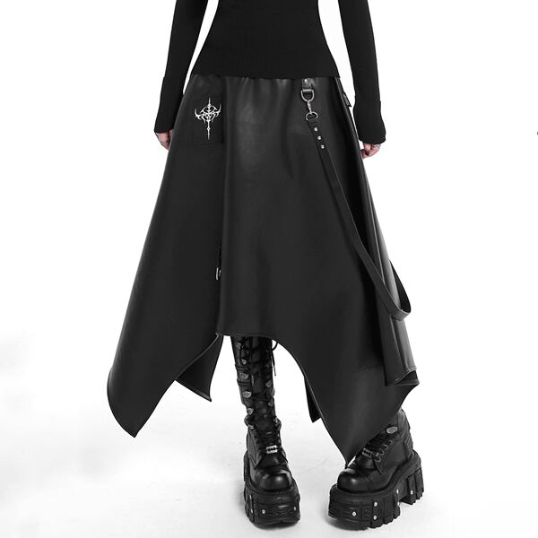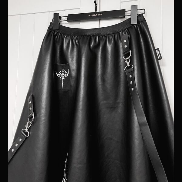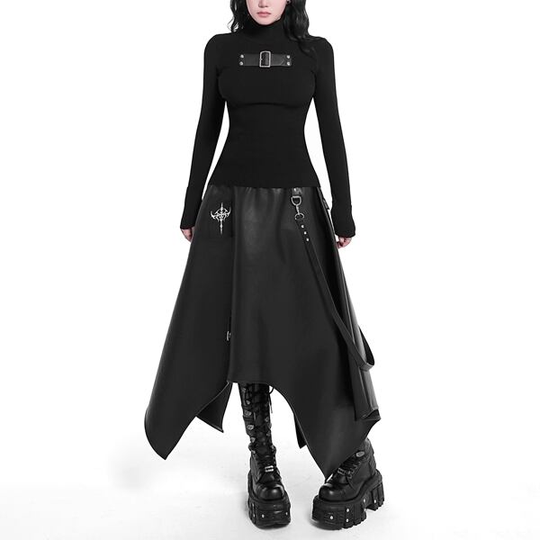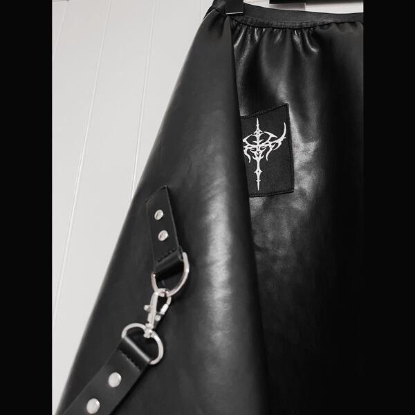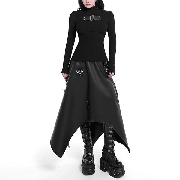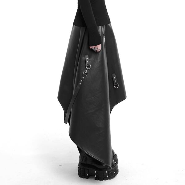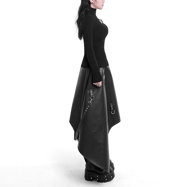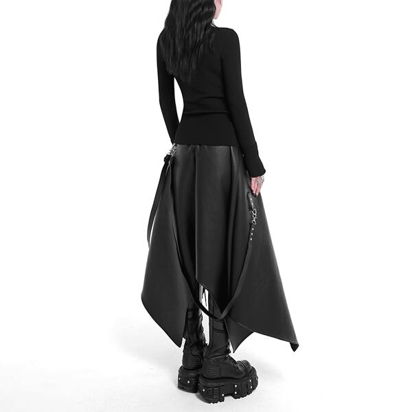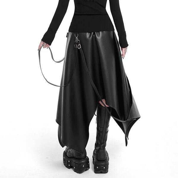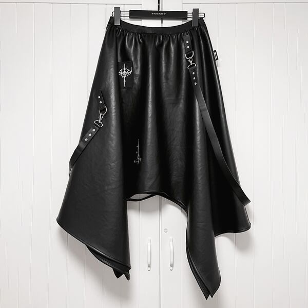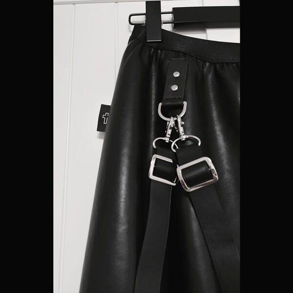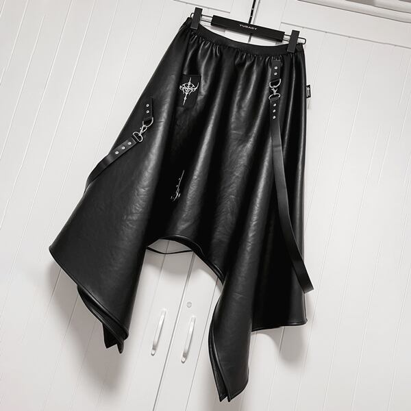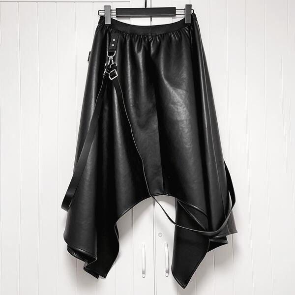 ウエストバンドアシメサイドストラップブラックPUスカート(ruf_02603)