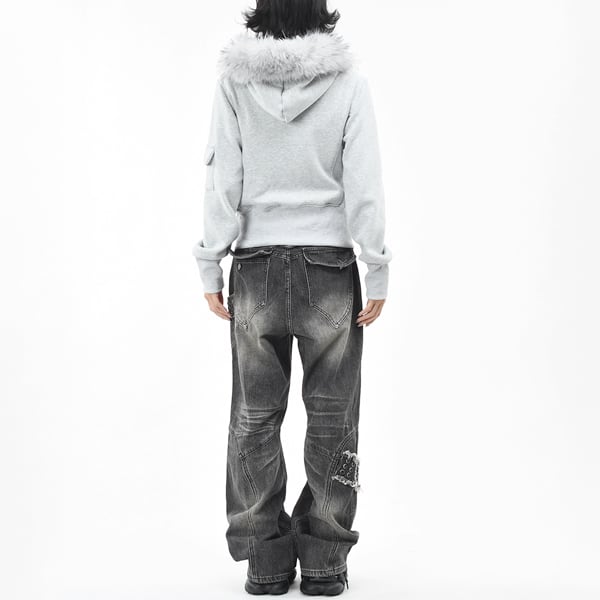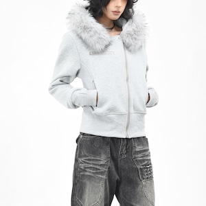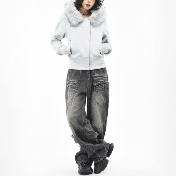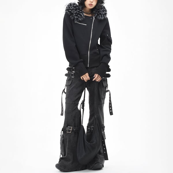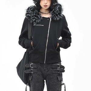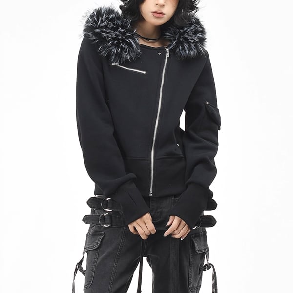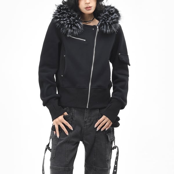 ファーエッジフードアシメジッパースタッズスリムスウェットジャケット(2カラーあり)(ruf_02611)