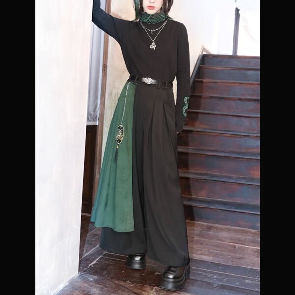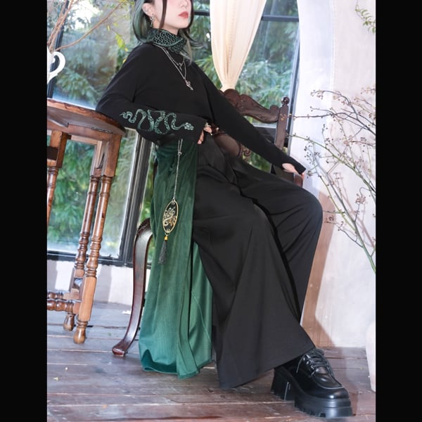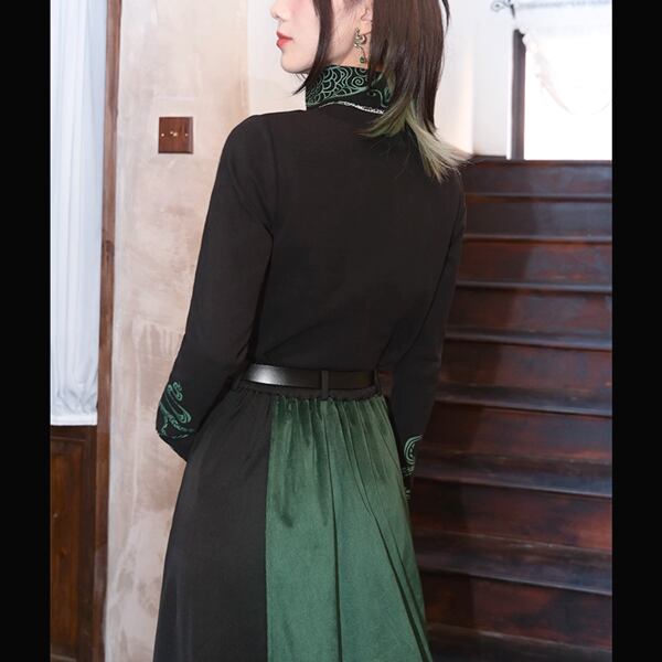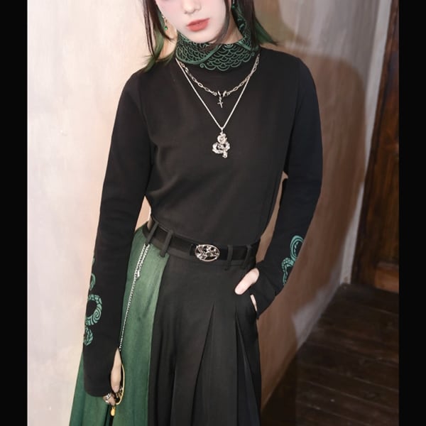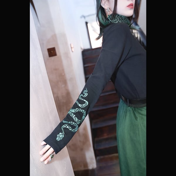 スネークスリーブハイネックグリーンブラックトップス(ruf_02628)