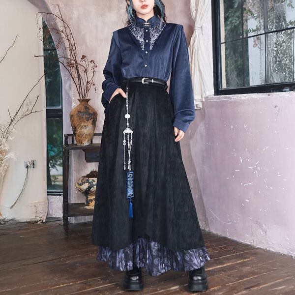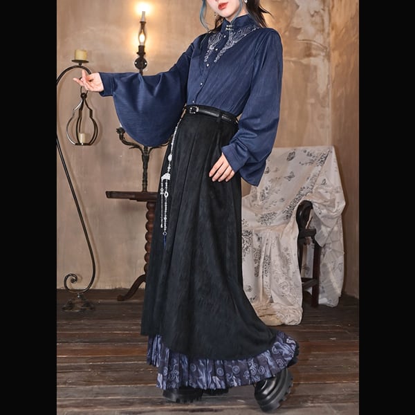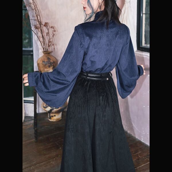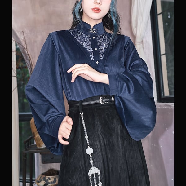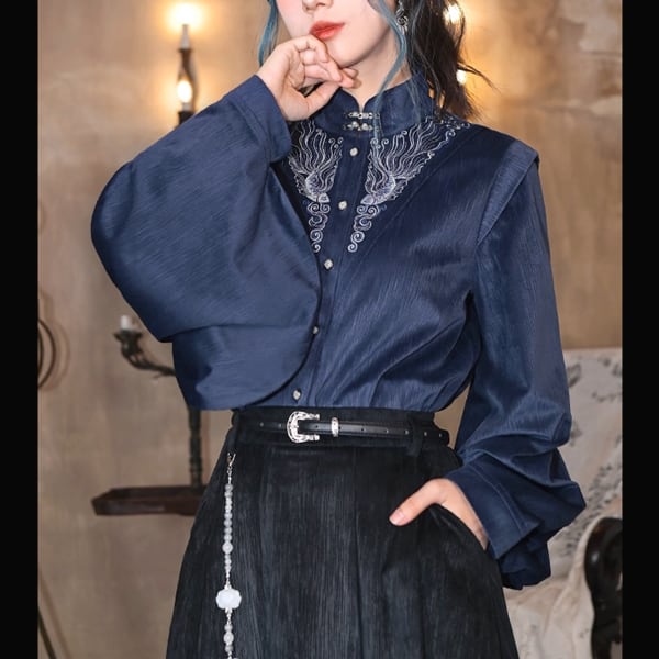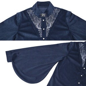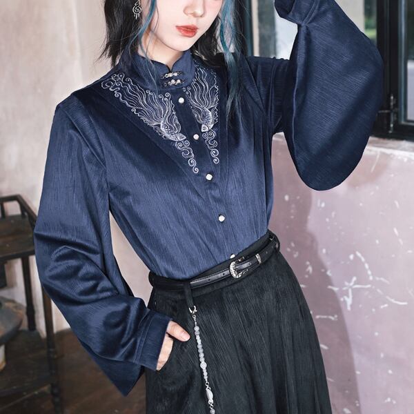 スタンドカラーフレアスリーブフロント刺繍シャツ(ruf_02675)