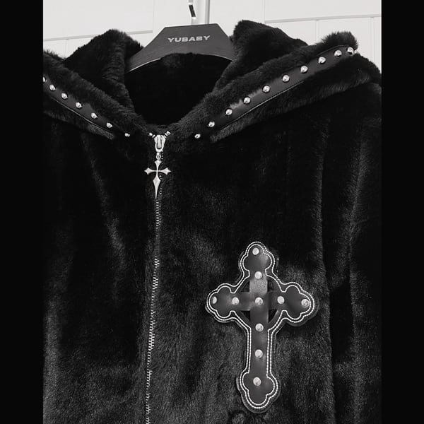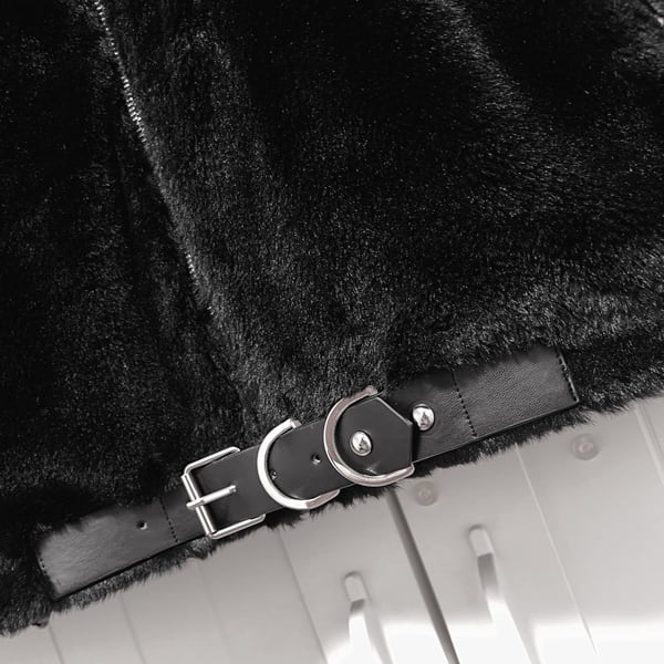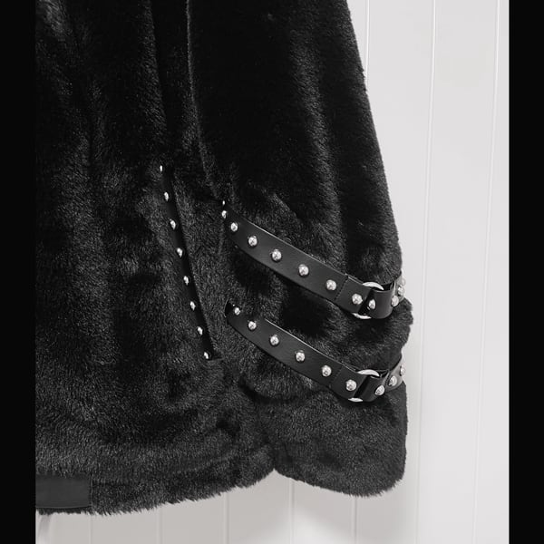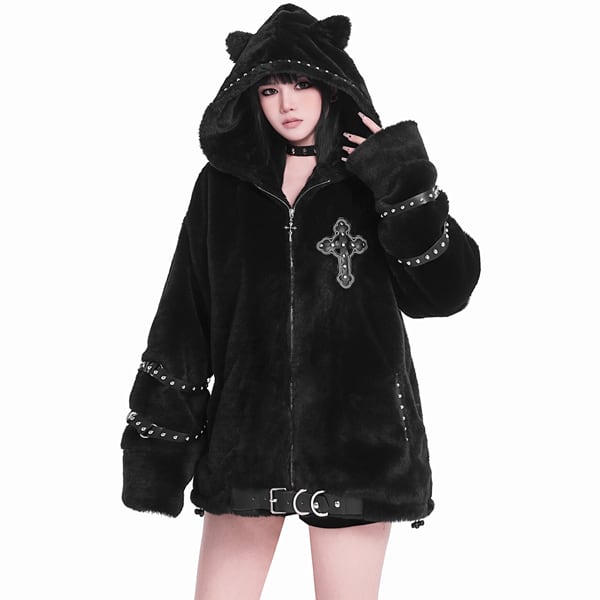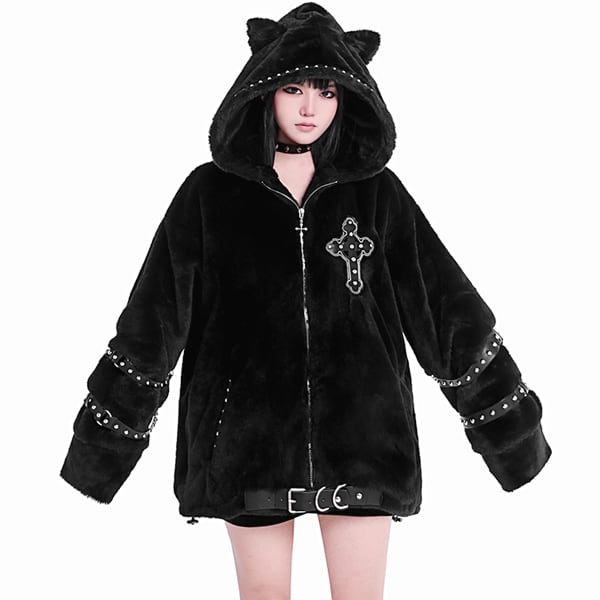 キャットフーディスリーブストラップスタッズベルトジップアップボアジャケット(ruf_02679)