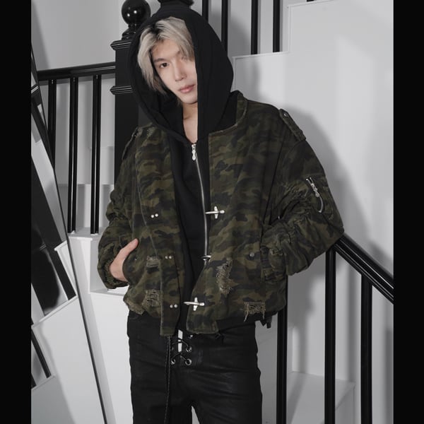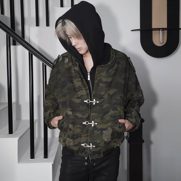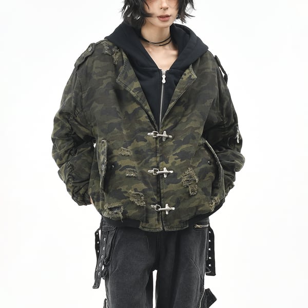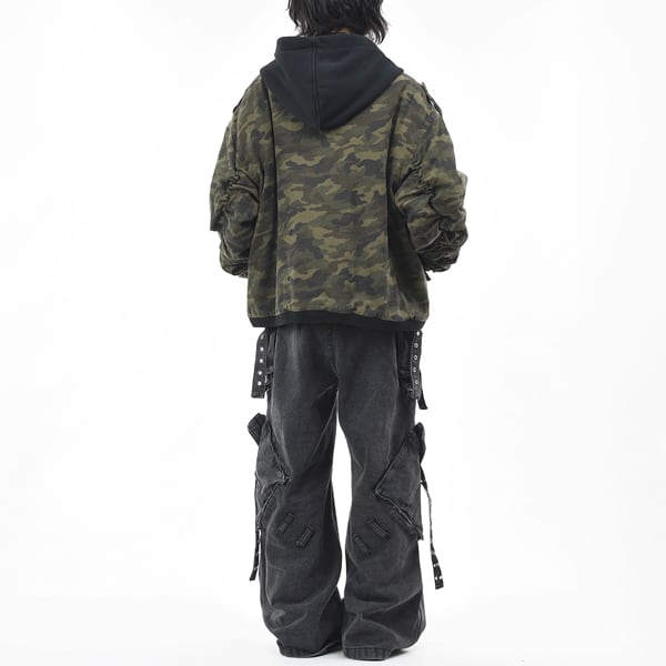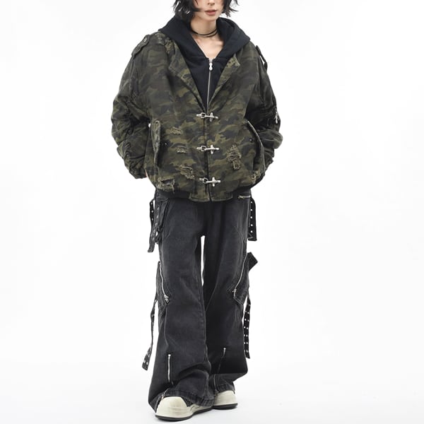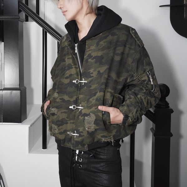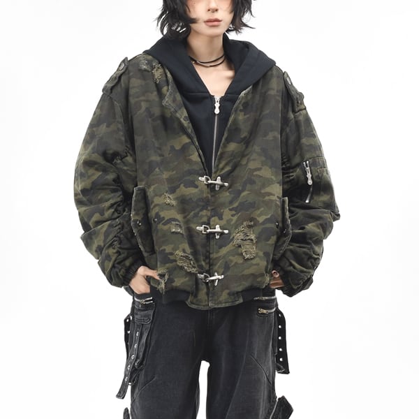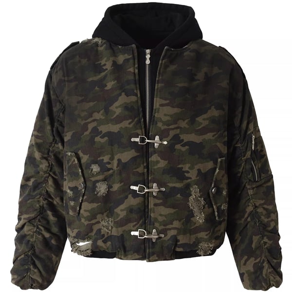 フェイクツーピースカモフラフーディダメージファイヤーマンバックルキルティング中綿ジャケット(ruf_02697)