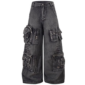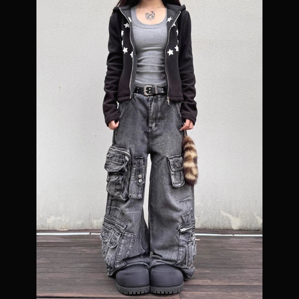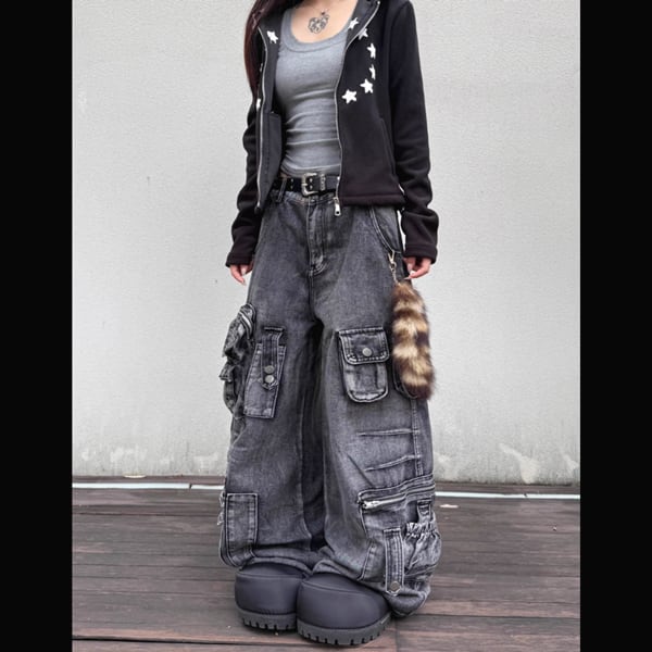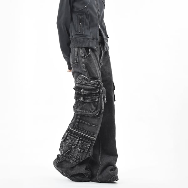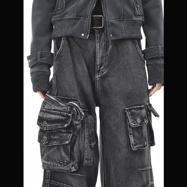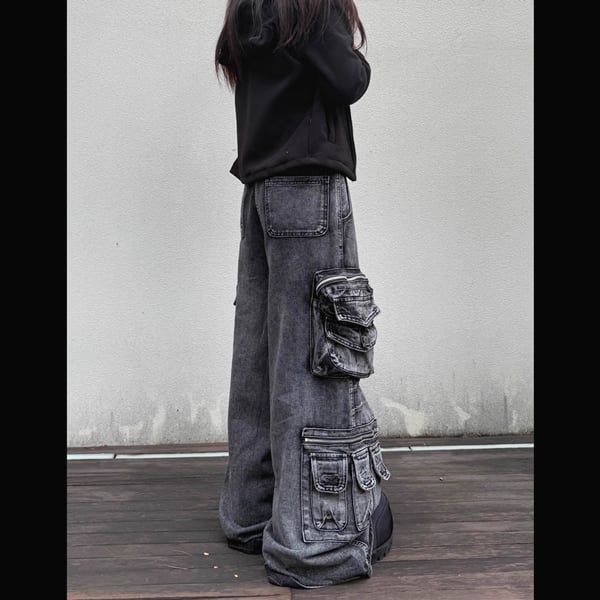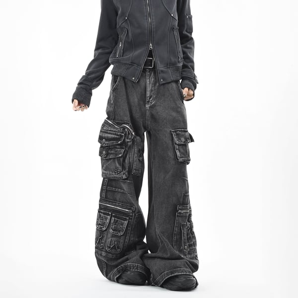 ウォッシュドブラックマルチサイドジッパーポケットワイドデニム(ruf_02702)
