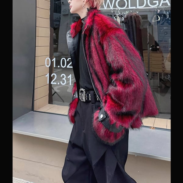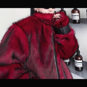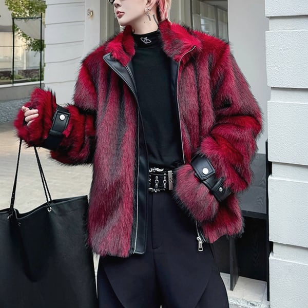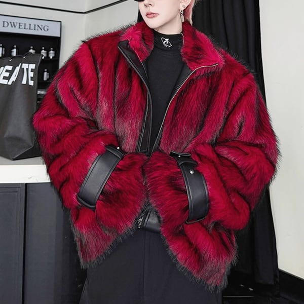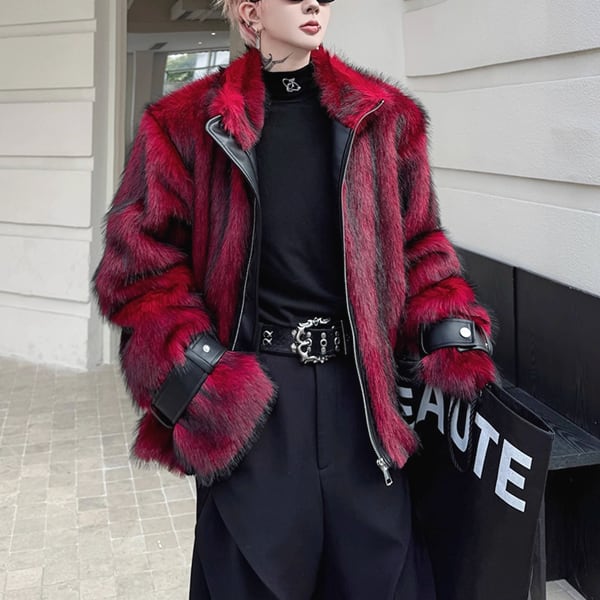 レッドフェイクファースリーブストラップPU切り替えジップアップジャケット(ruf_02709)