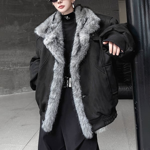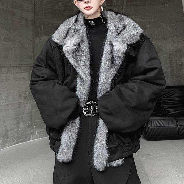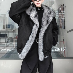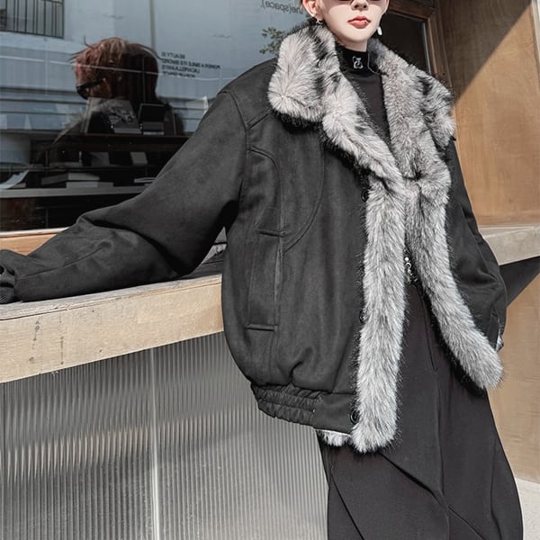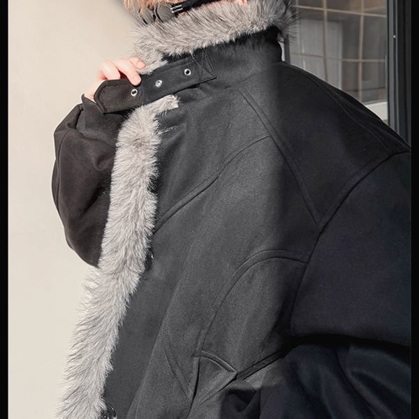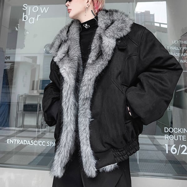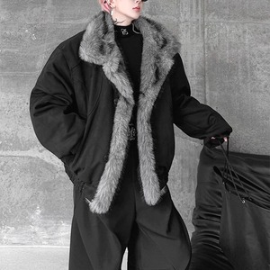 ハイネックストラップグレーフェイクファーブラックジャケット(ruf_02711)
