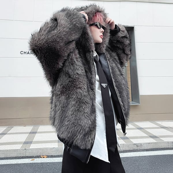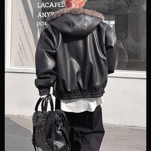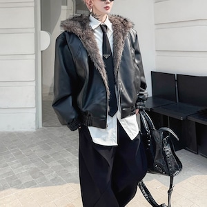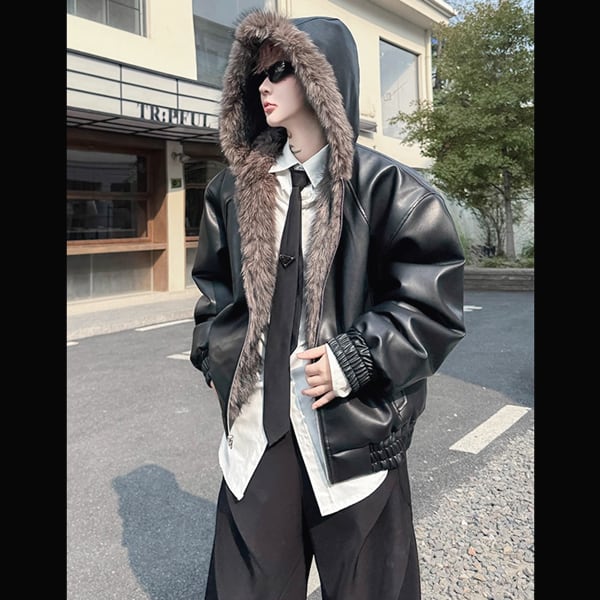 リバーシブルブラウンフェイクファージップアップフーディPUブラックジャケット(ruf_02713)