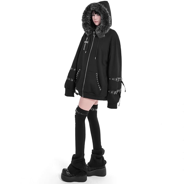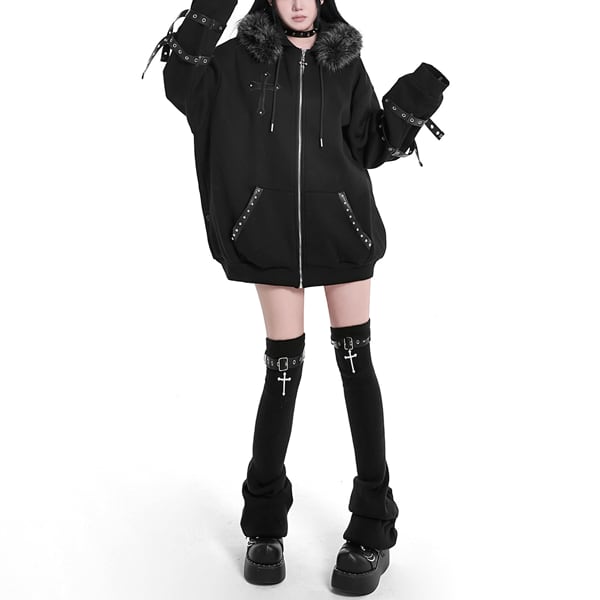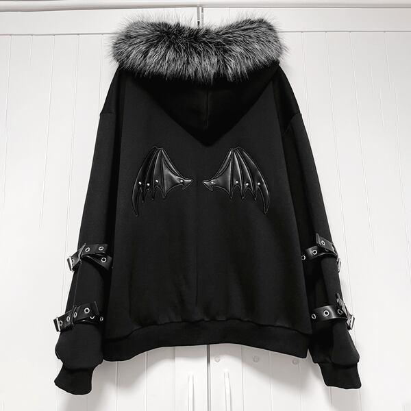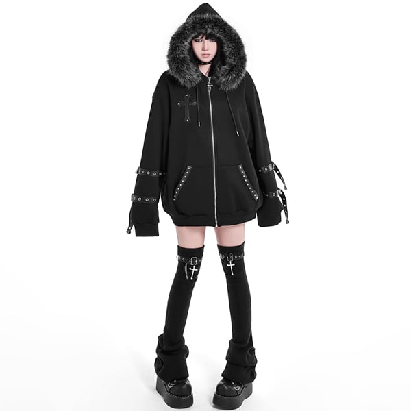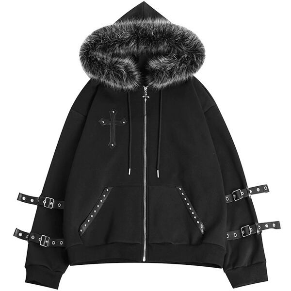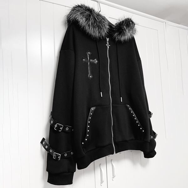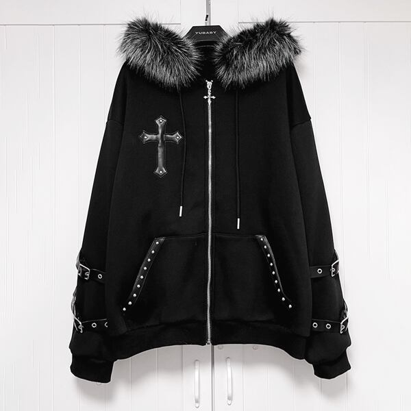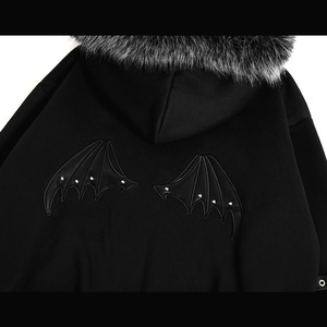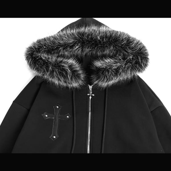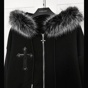 クロスウィングファーフード裏起毛ブラックジップフーディ(ruf_02725)