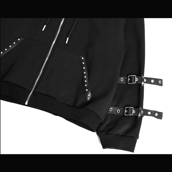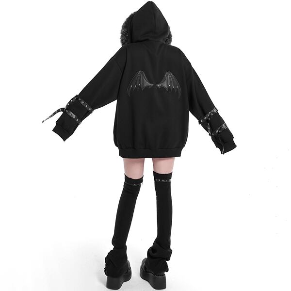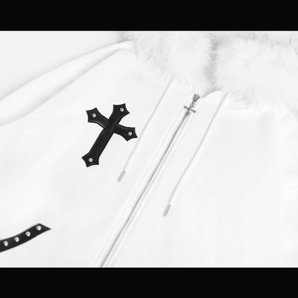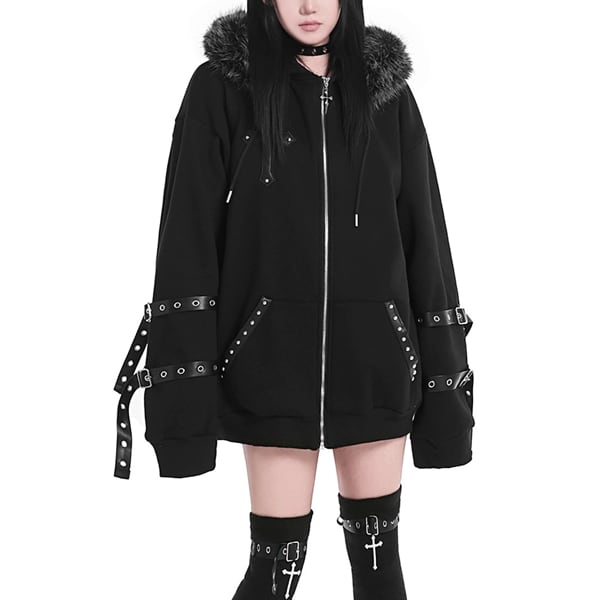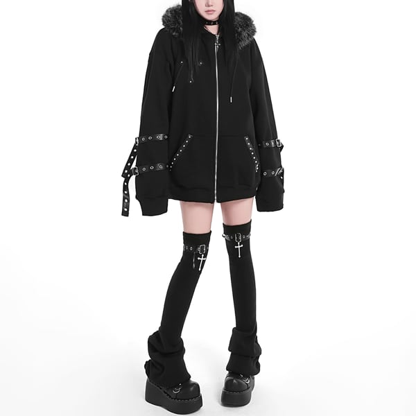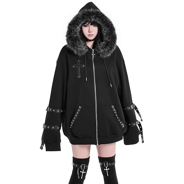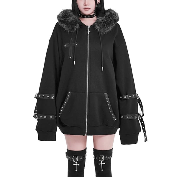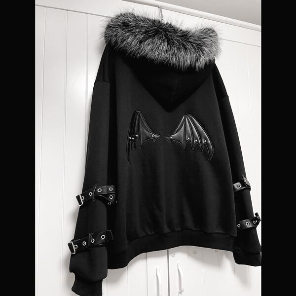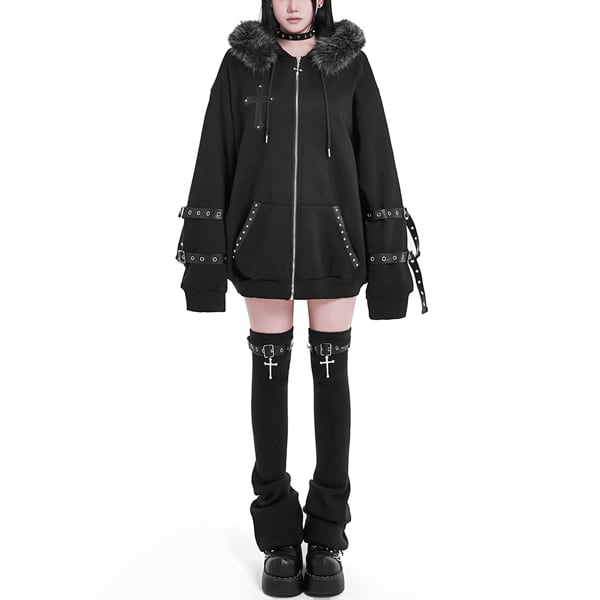 クロスウィングファーフード裏起毛ブラックジップフーディ(ruf_02725)