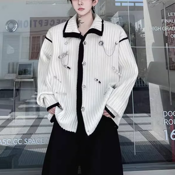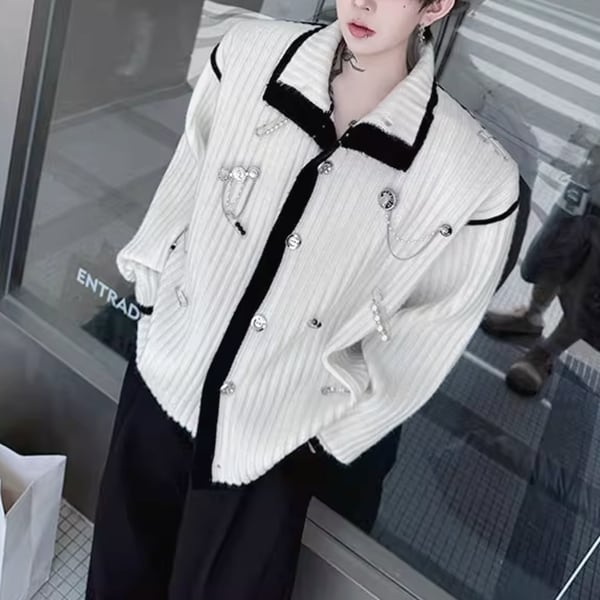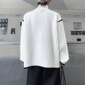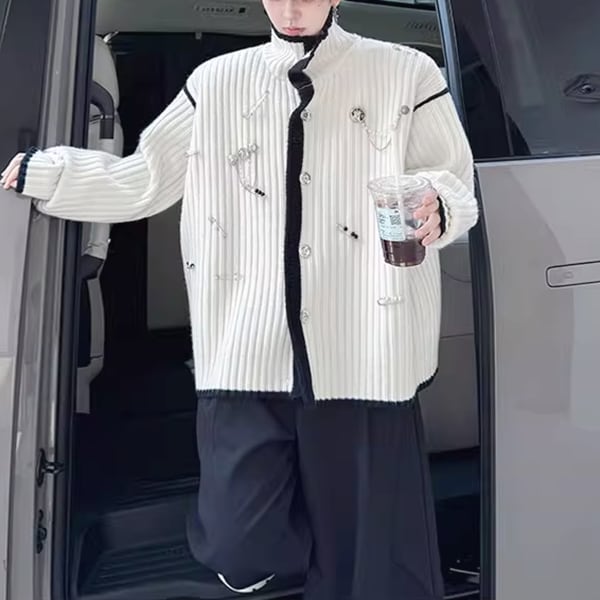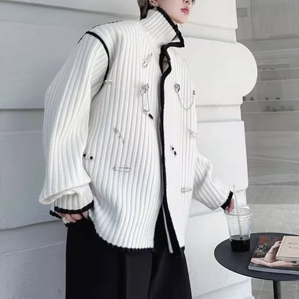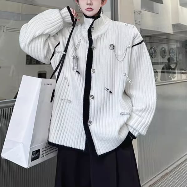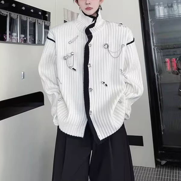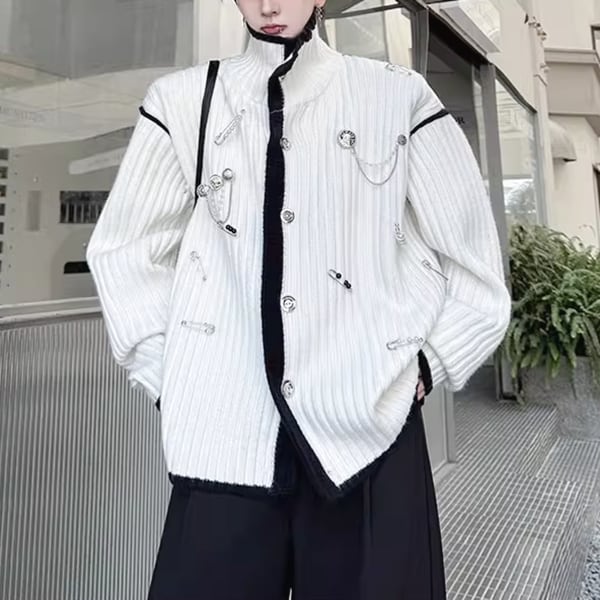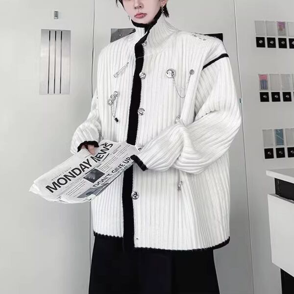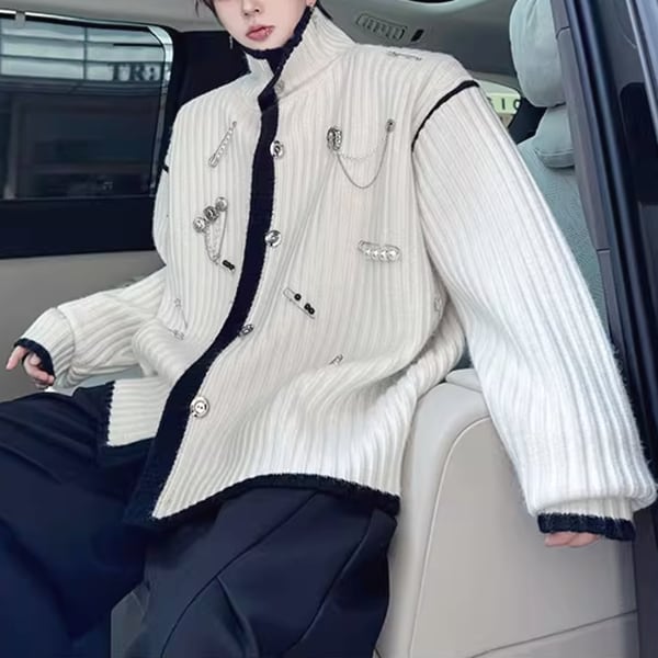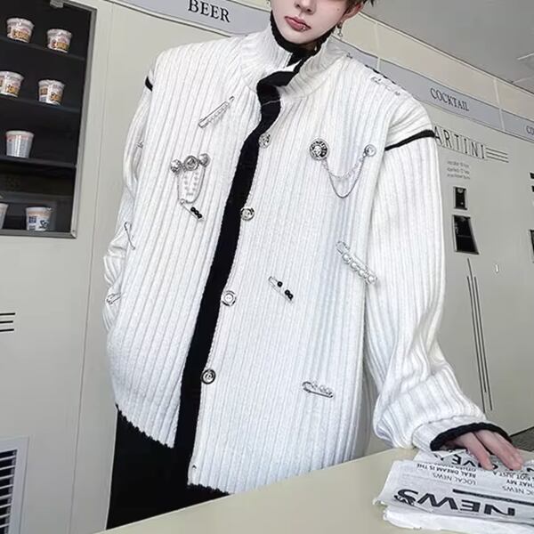 メタルバッジリブニットスタンドカラーホワイトカーディガン(ruf_02790)