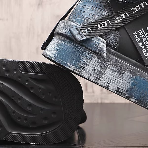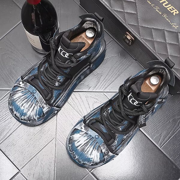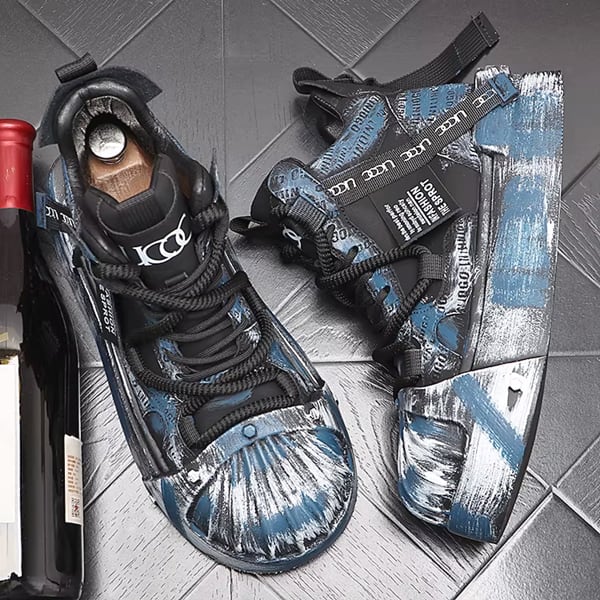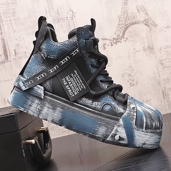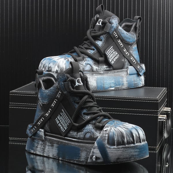 ◆【RANK6】ブラックブルーブラッシュペイントグランジハイカットスニーカー(ruf_02794)