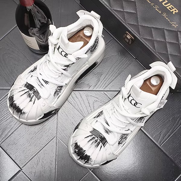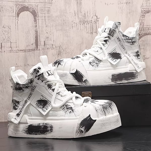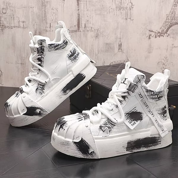 ◆【RANK4】ホワイトブラックブラッシュペイントグランジハイカットスニーカー(ruf_02795)