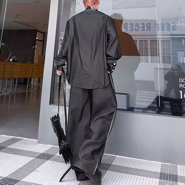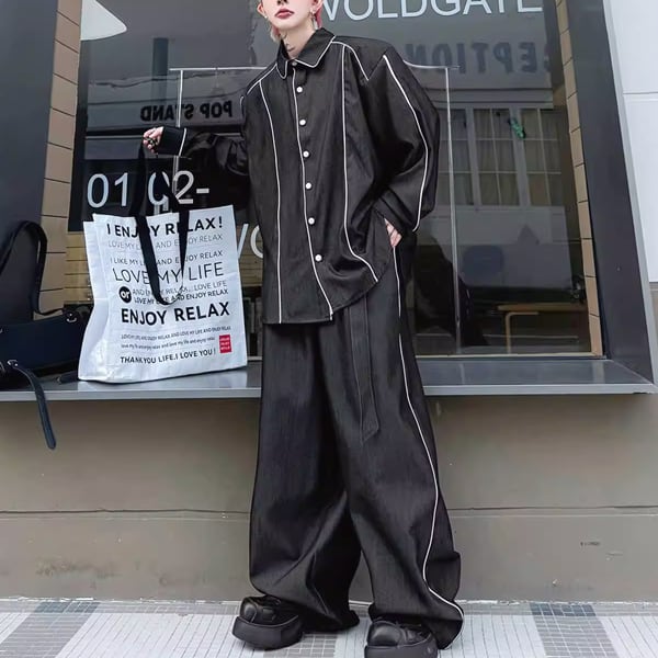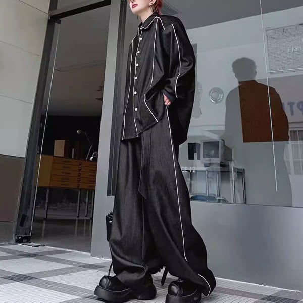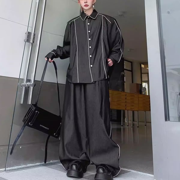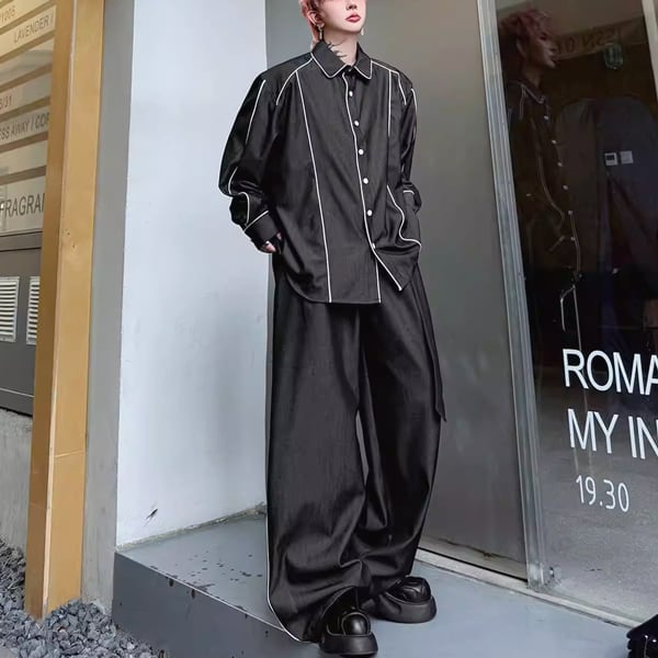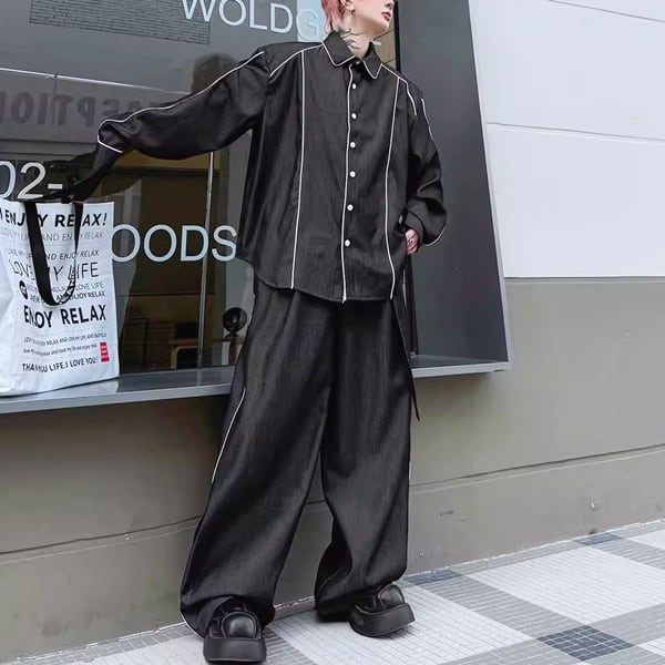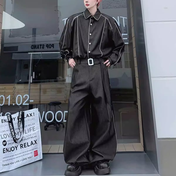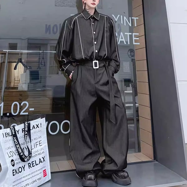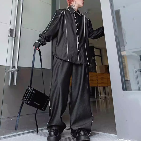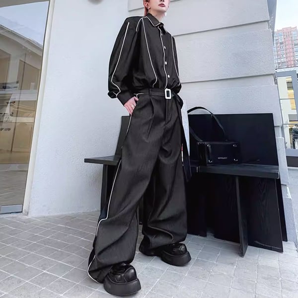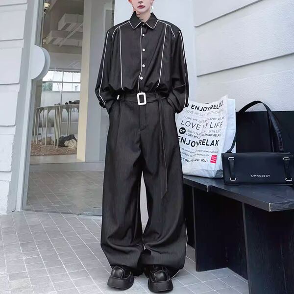ブラックコントラストパイピング シャツ×ワイドパンツ セットアップ【ベルト付き】(ruf_02800)