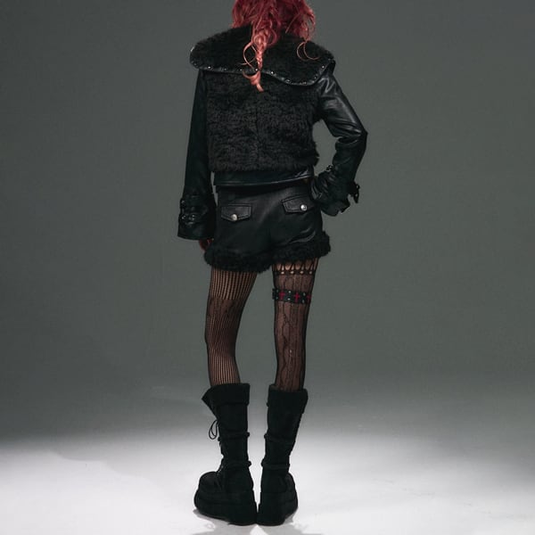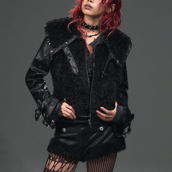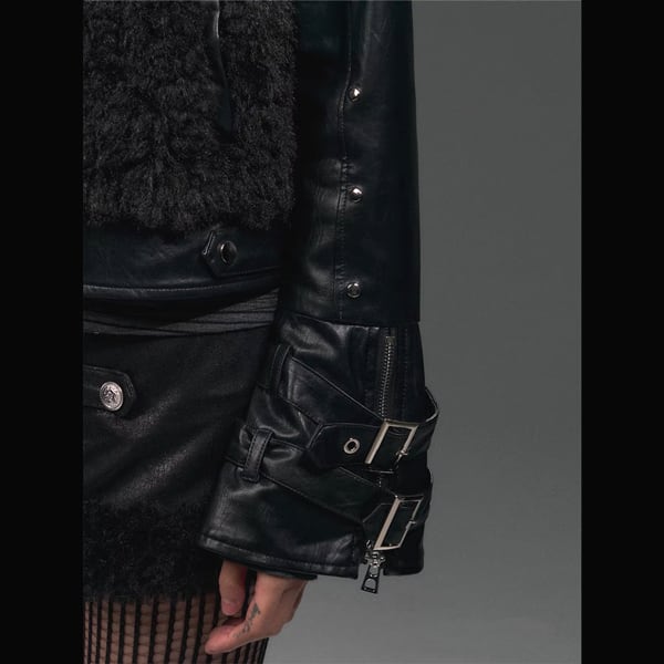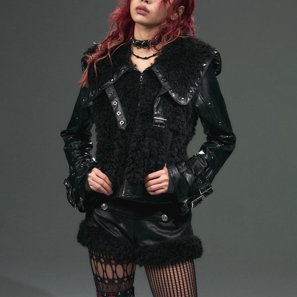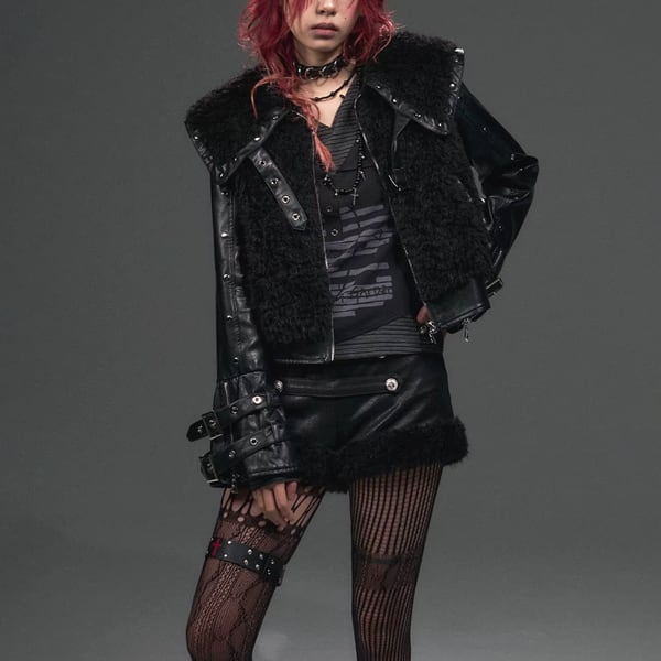 スタッズファーコンビベルトスリーブパンクレザージャケット(ruf_02843)