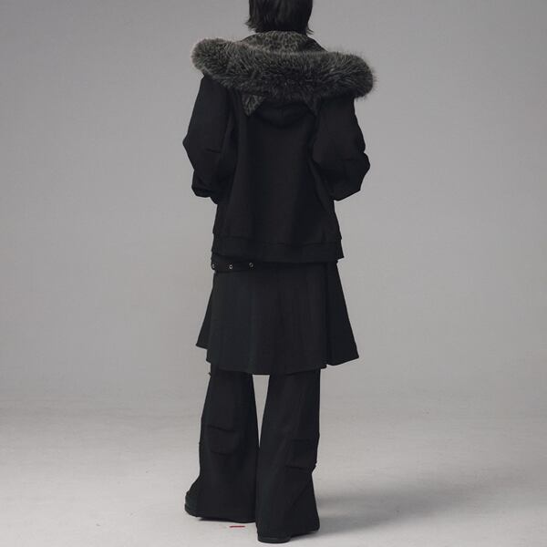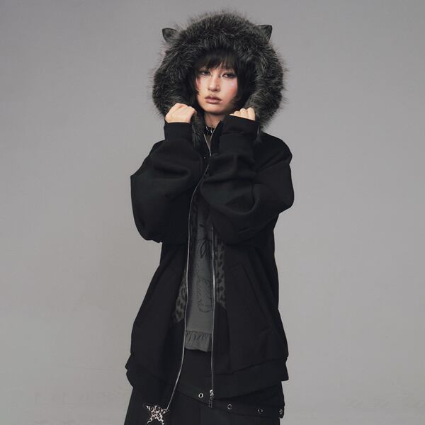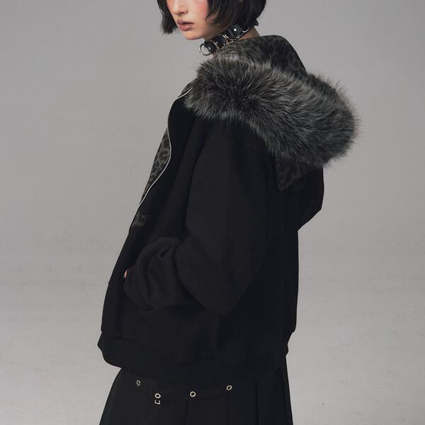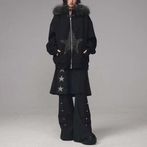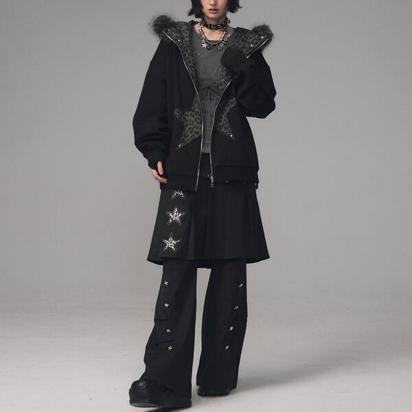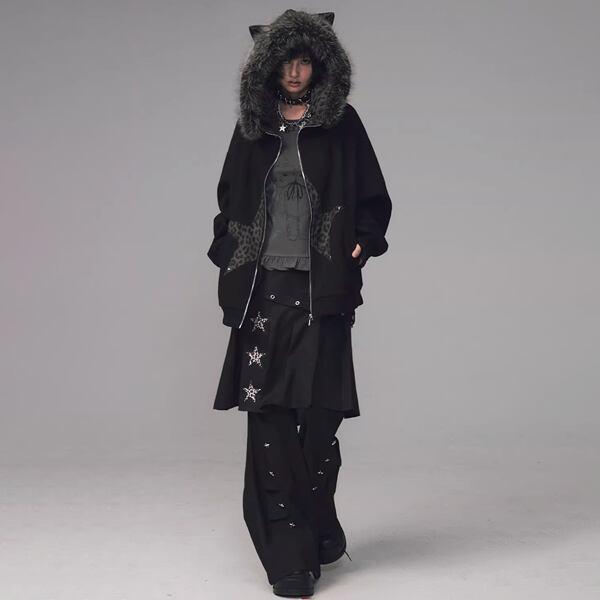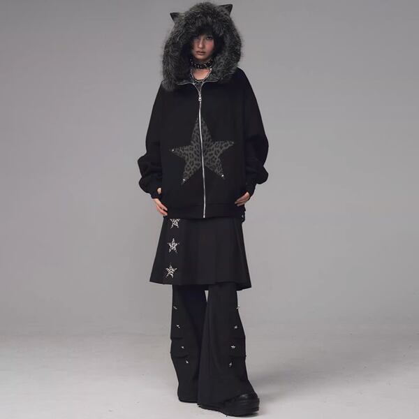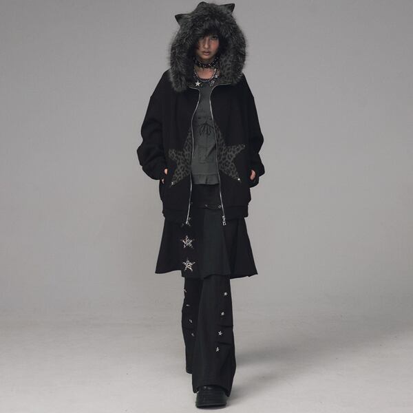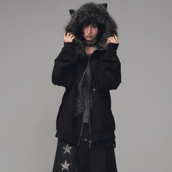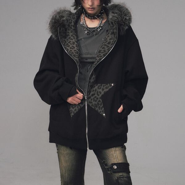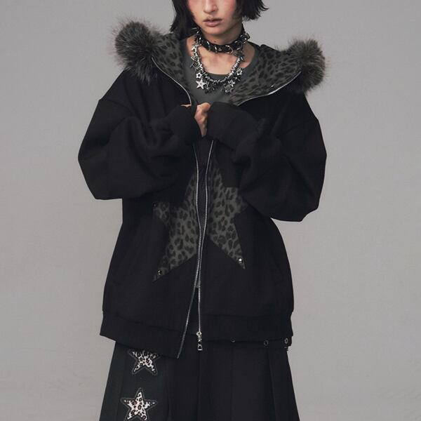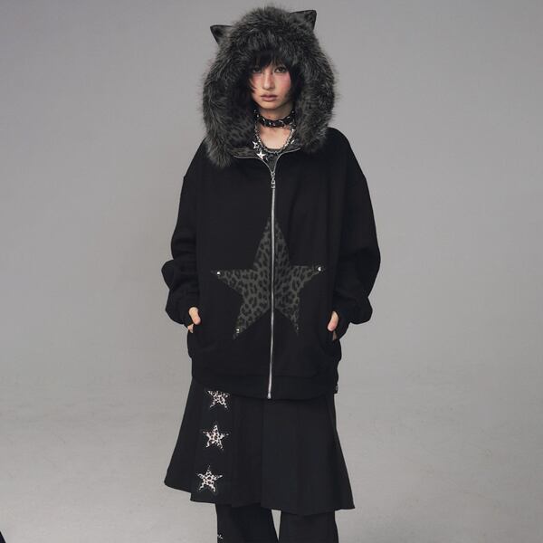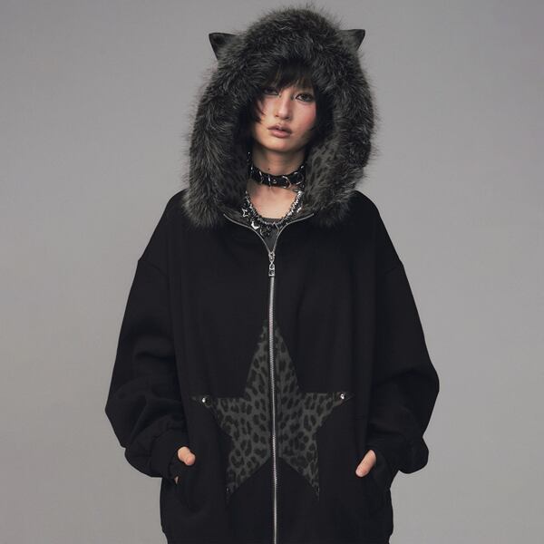 キャットイヤーファーフード レオパードスタージップパーカー(ruf_02847)