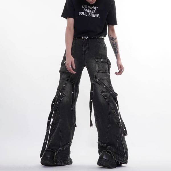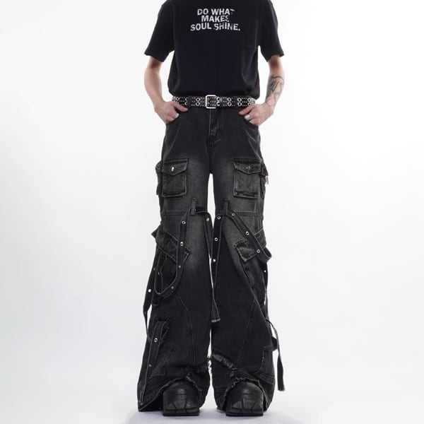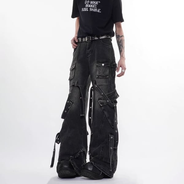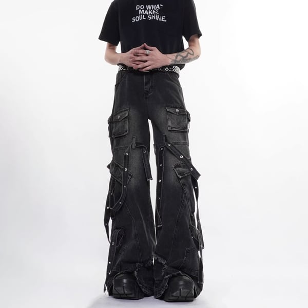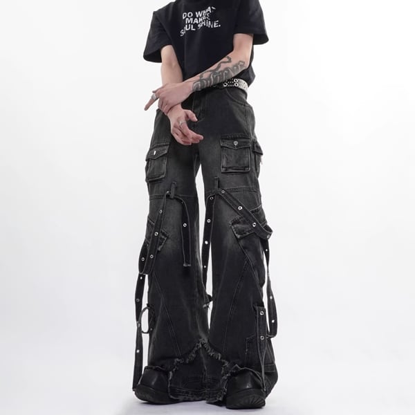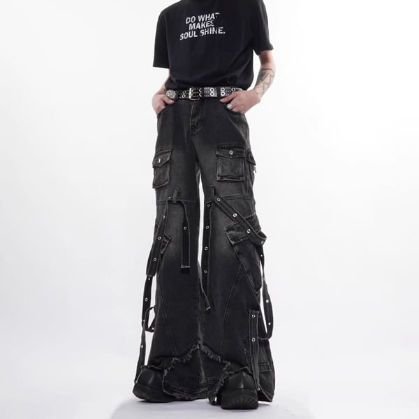 ストラップカーゴウォッシュドフレアデニムパンツ(ruf_02883)