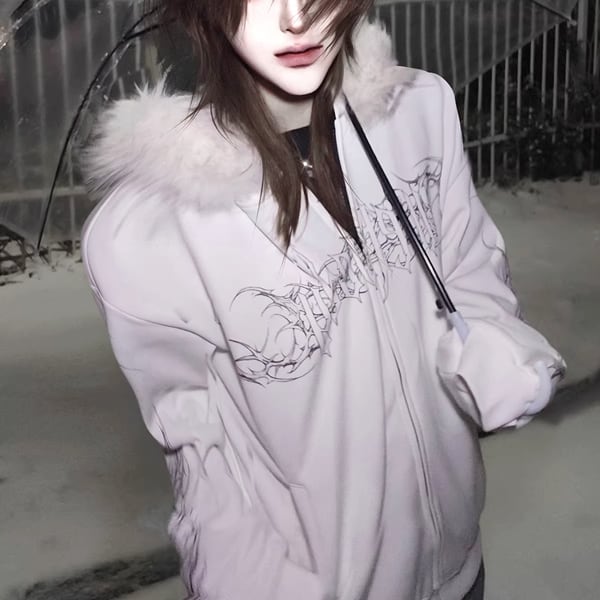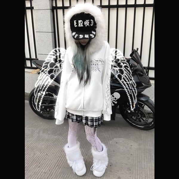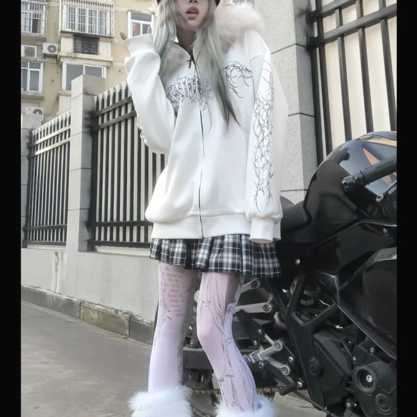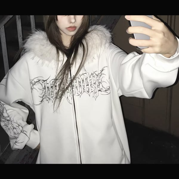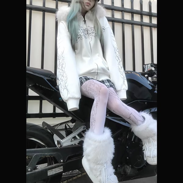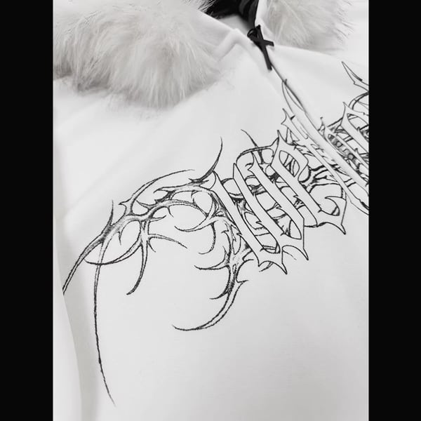 ゴシックタトゥープリントファーフードホワイトジップフーディ(ruf_02926)