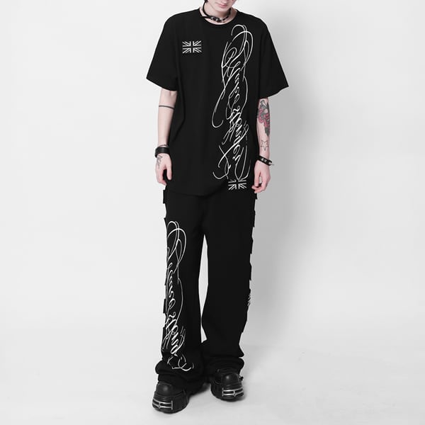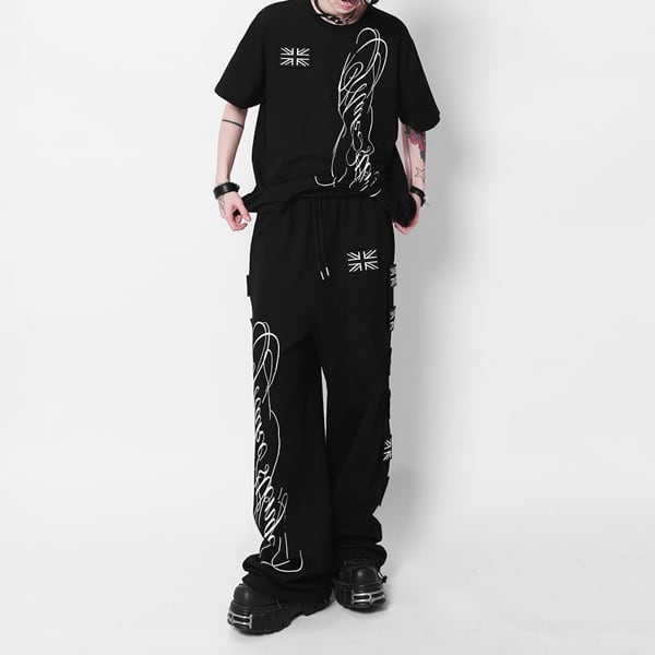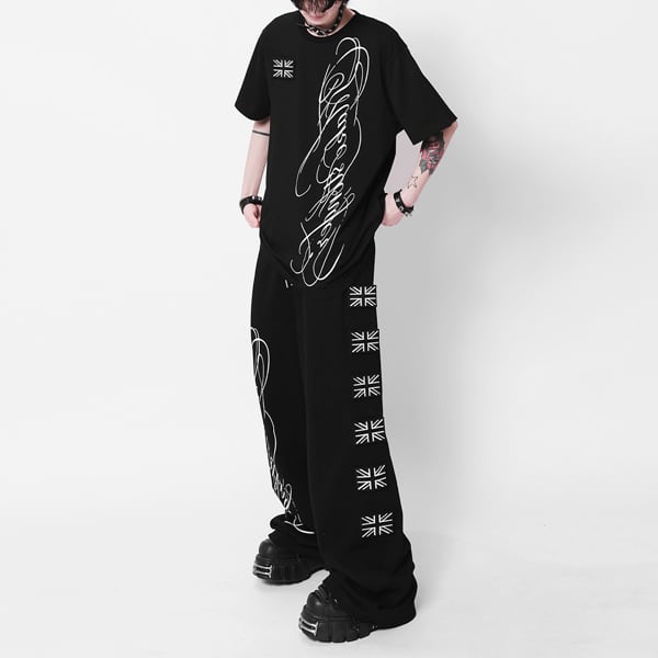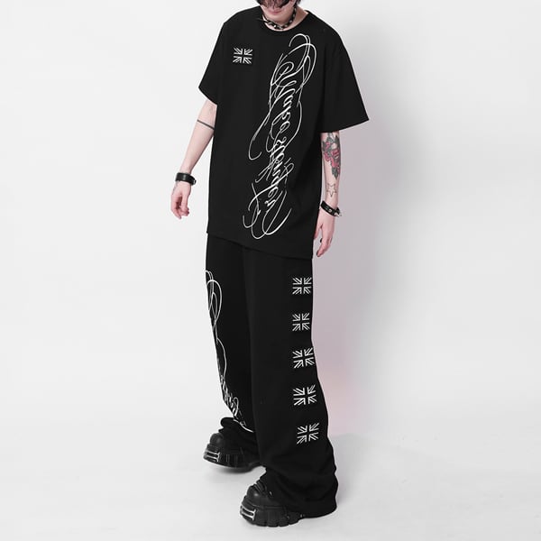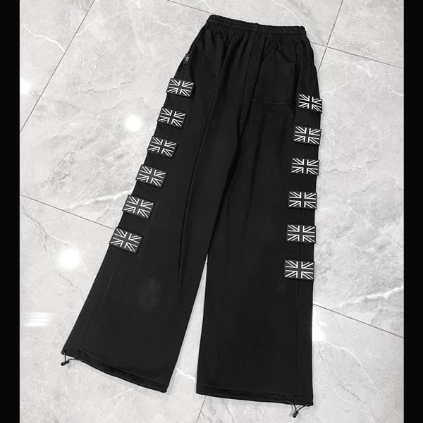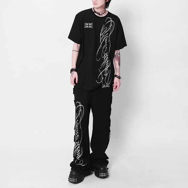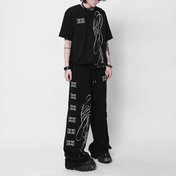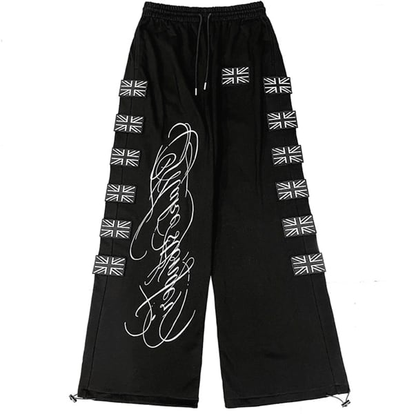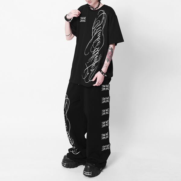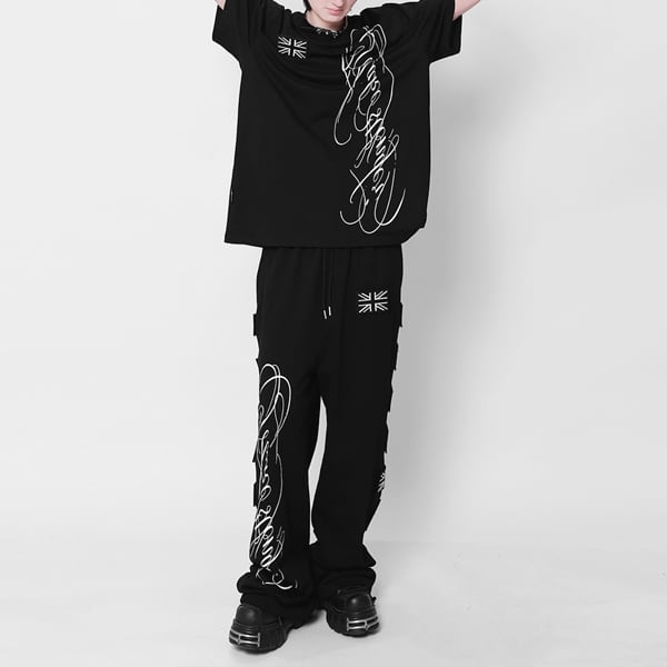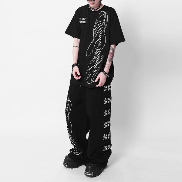 ユニオンジャックパッチ スクリプトプリント ドローコードワイドパンツ(ruf_03009)