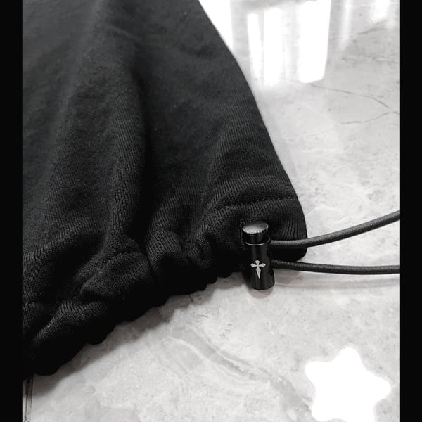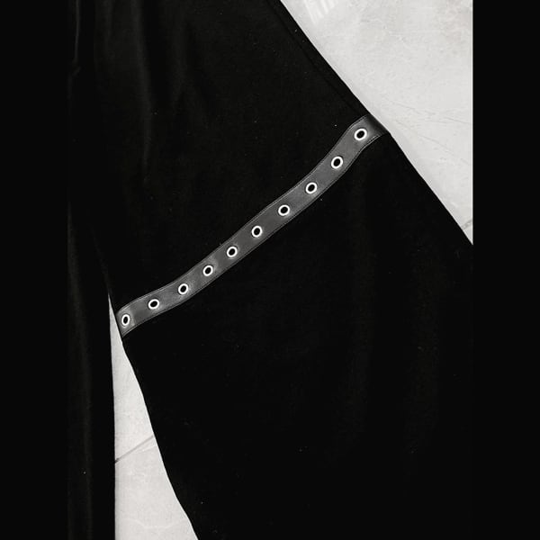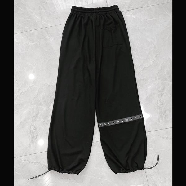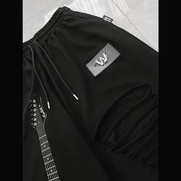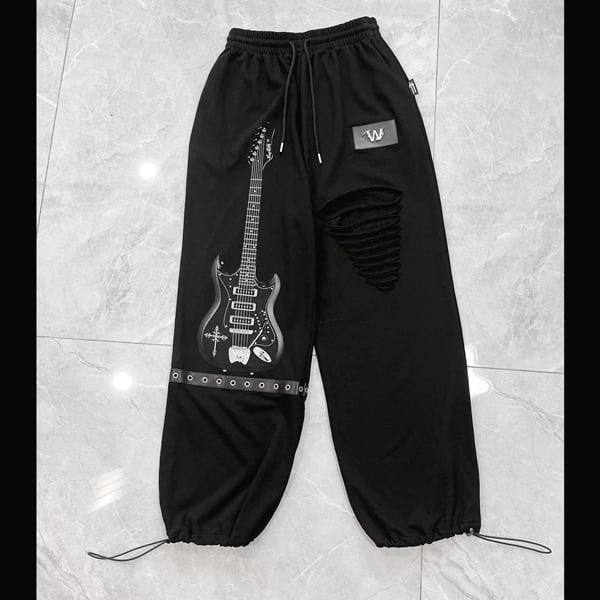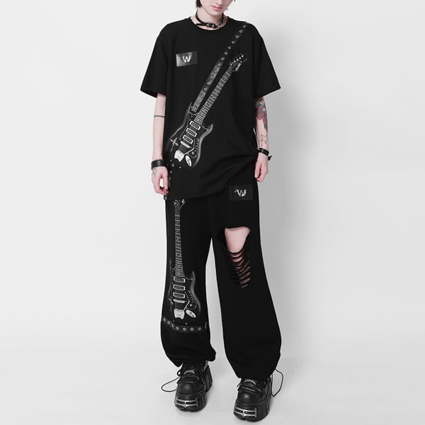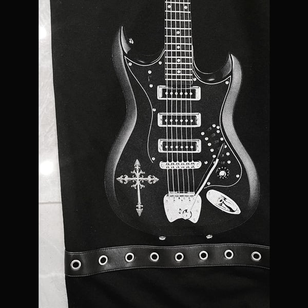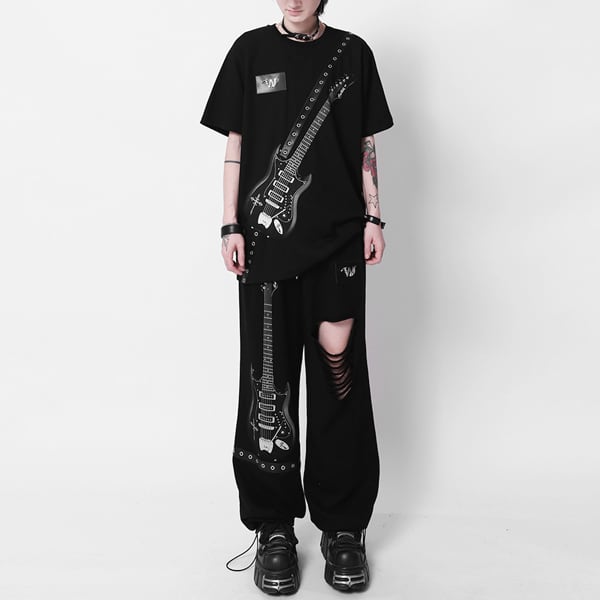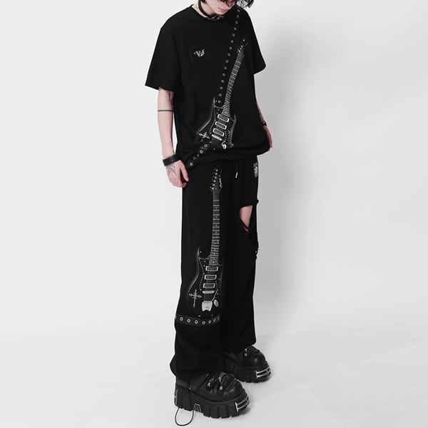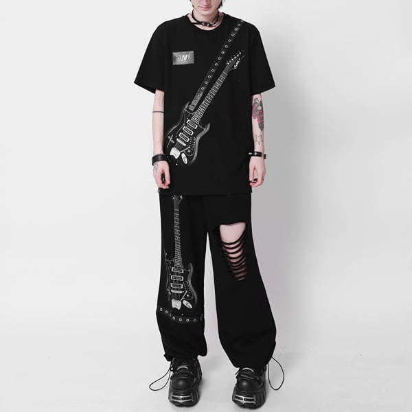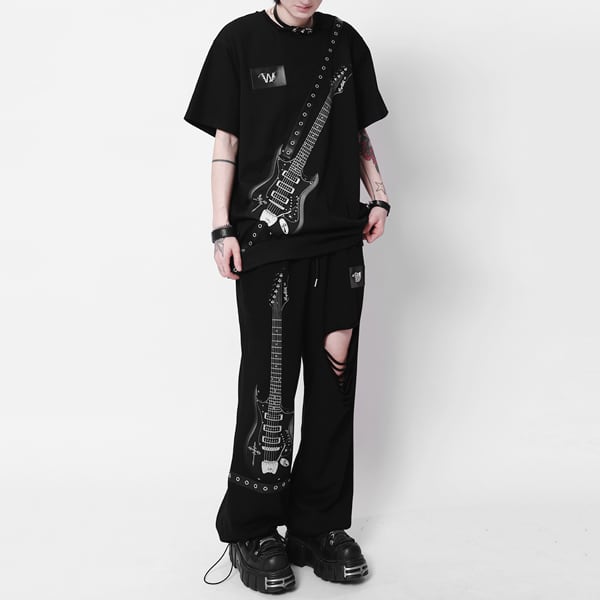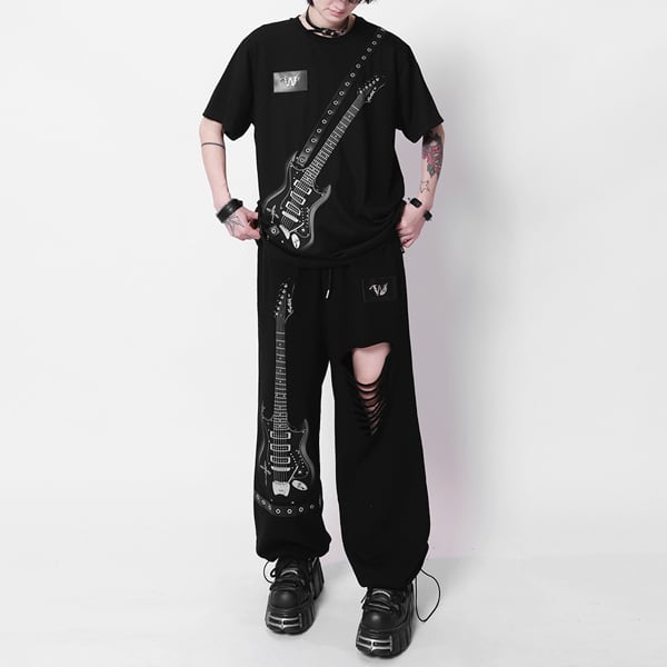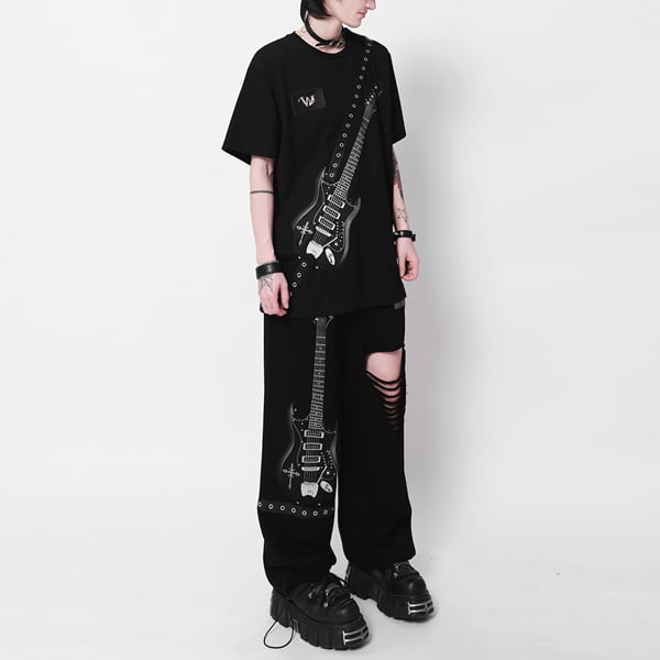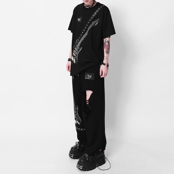 ドローコードブラックエレキギタープリント ダメージハトメベルトパンツ(ruf_03011)