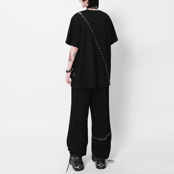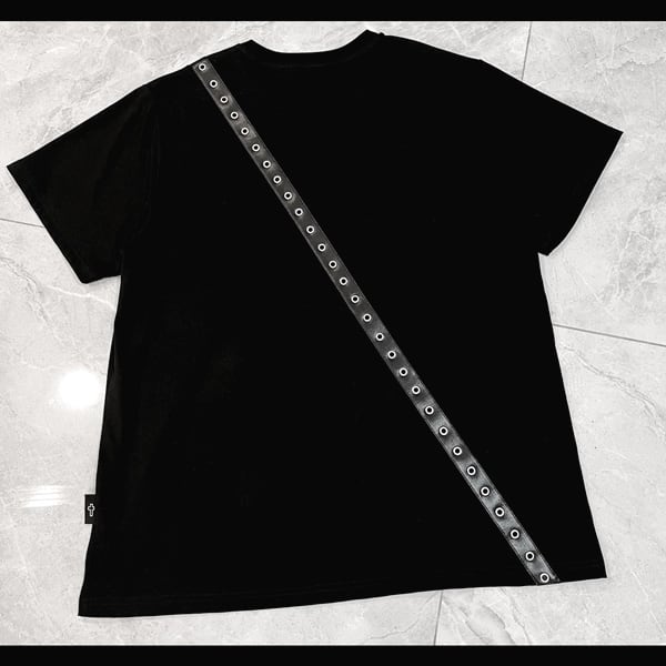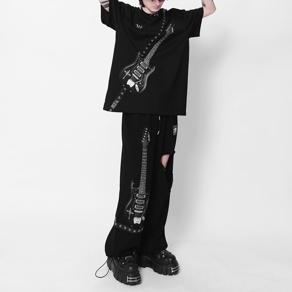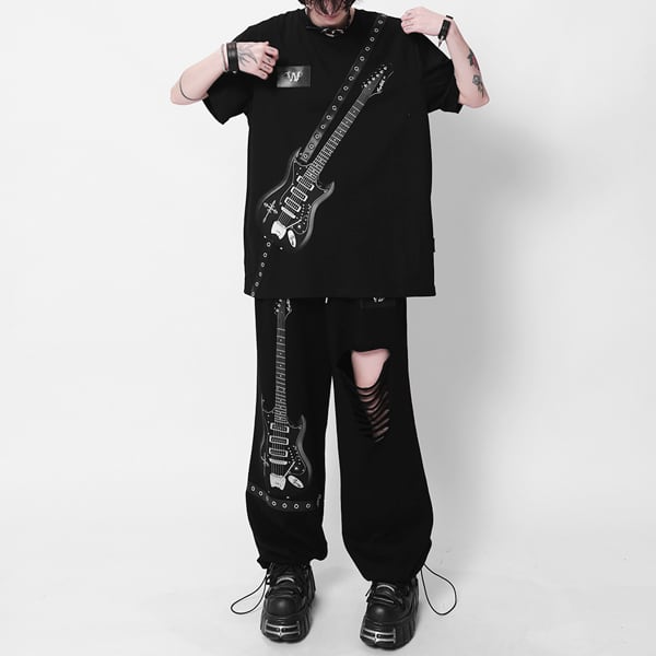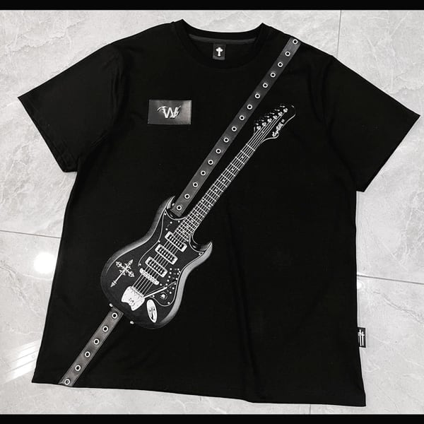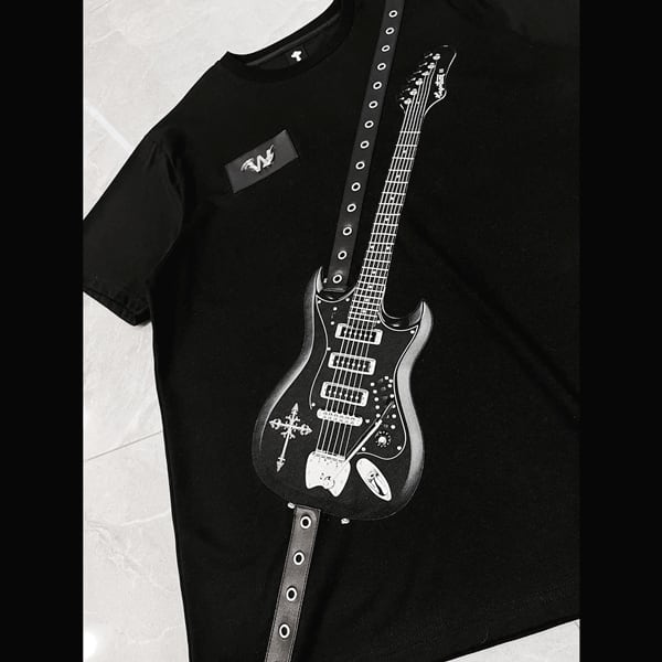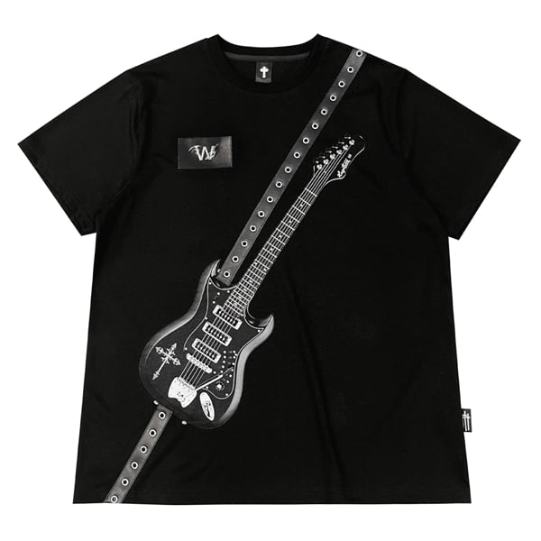 ブラックエレキギタープリント ハトメベルトデザインTシャツ(ruf_03012)
