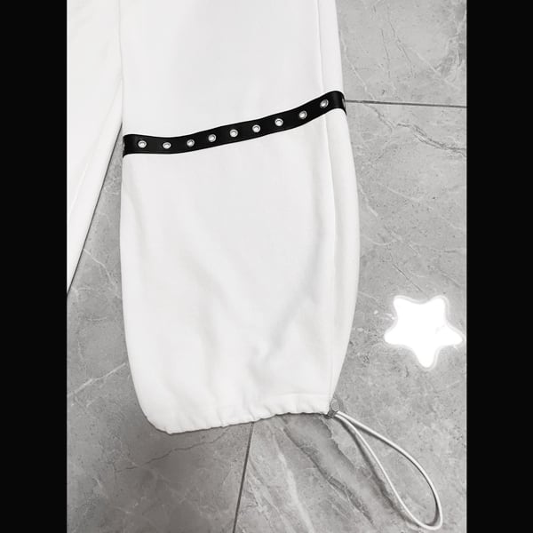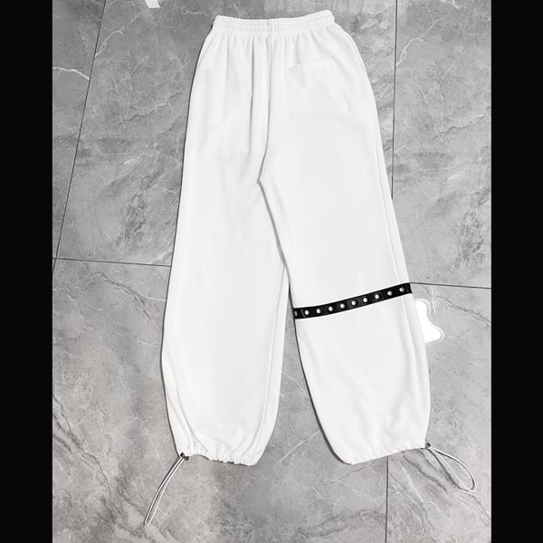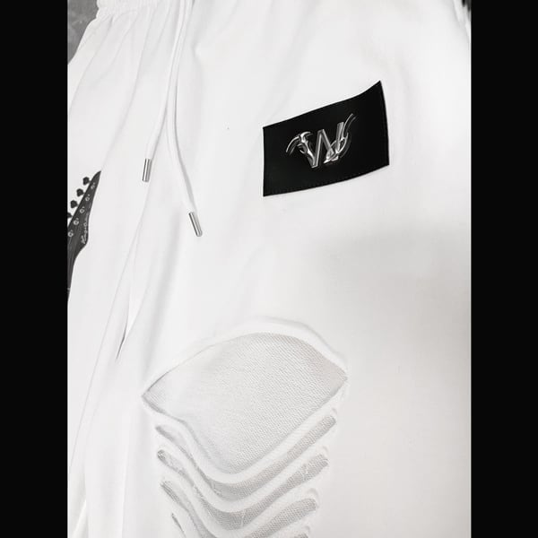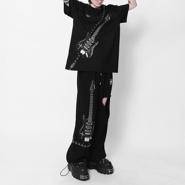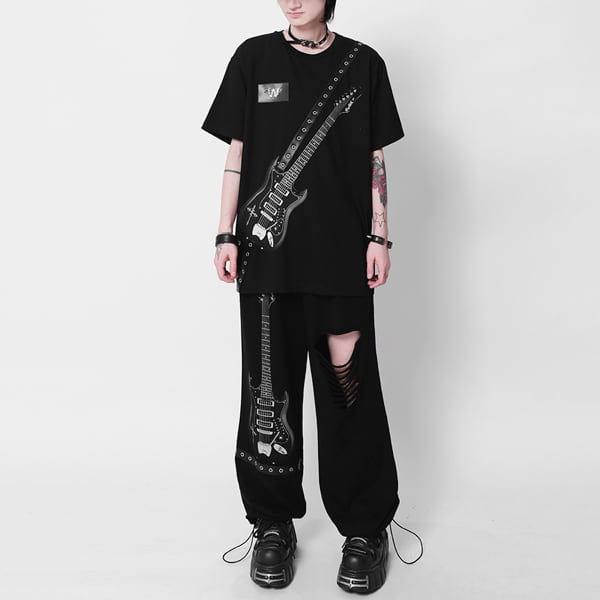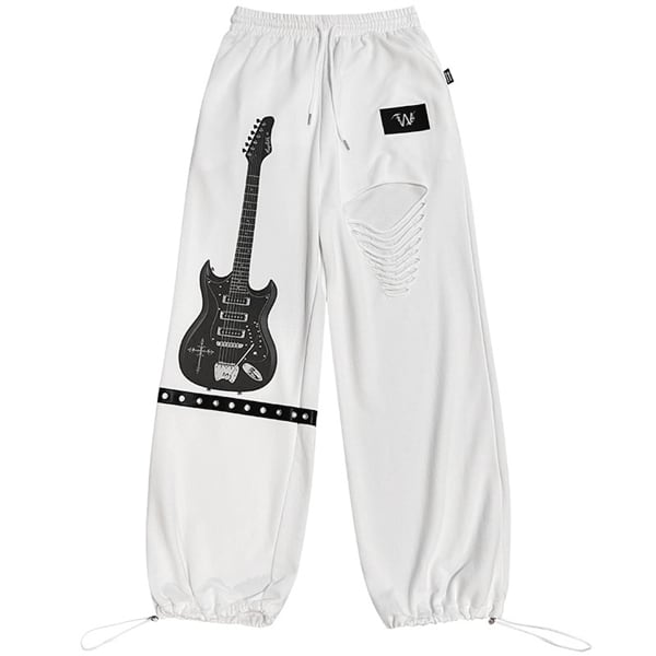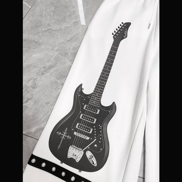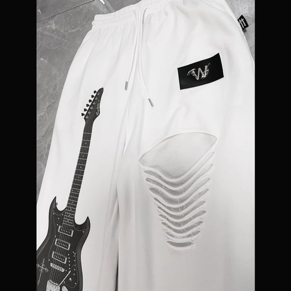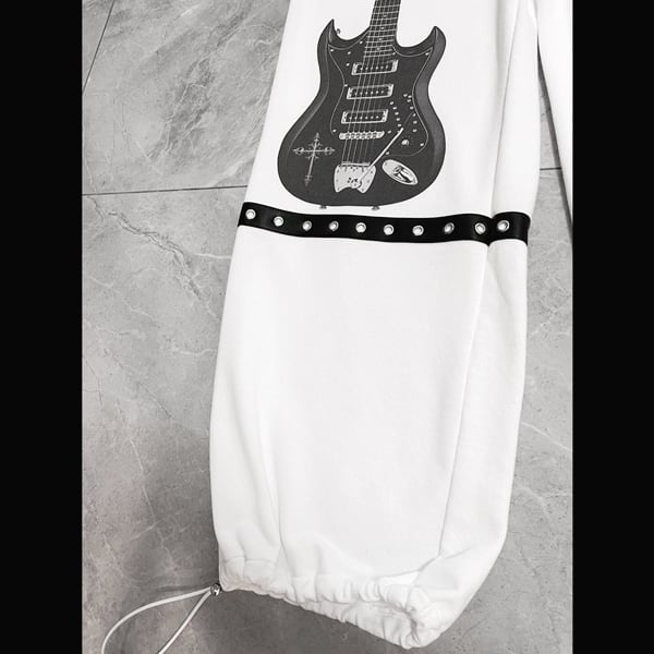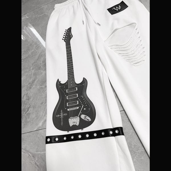 ドローコードホワイトエレキギタープリント ダメージハトメベルトパンツ(ruf_03032)