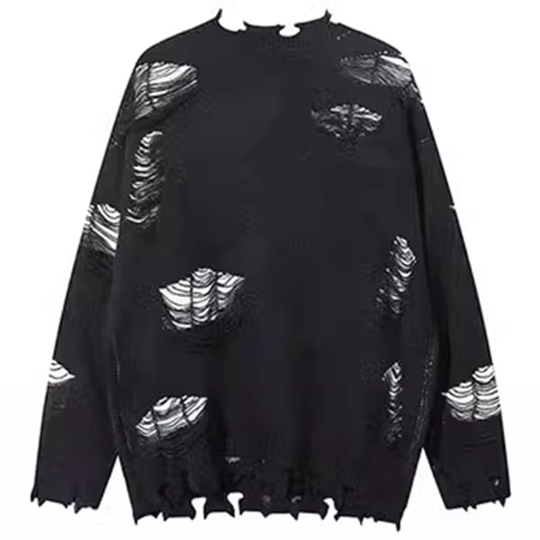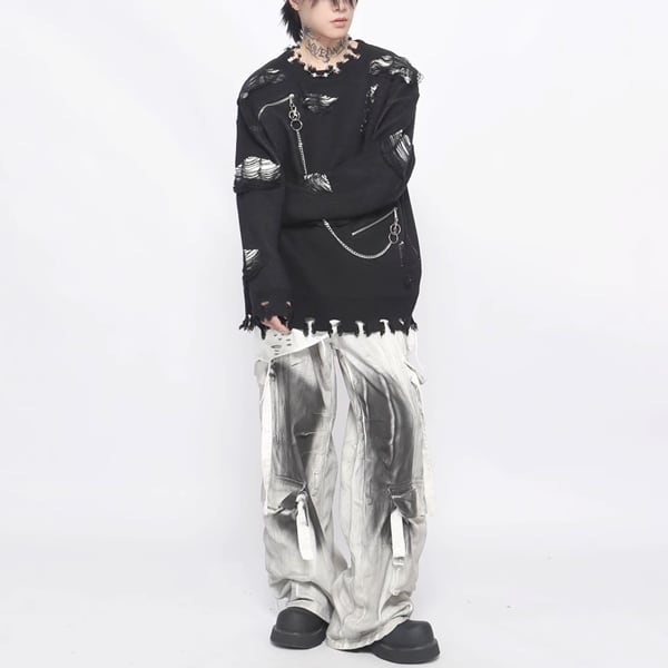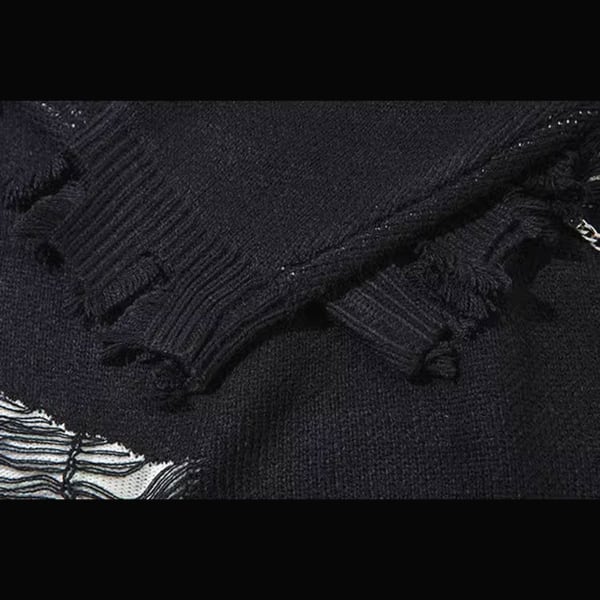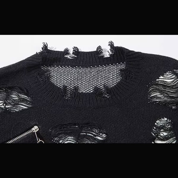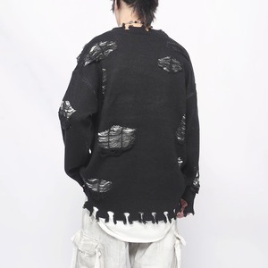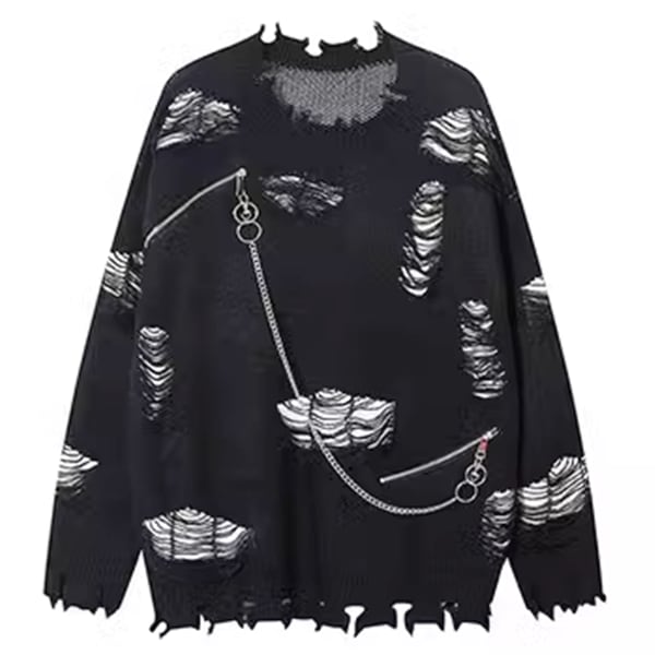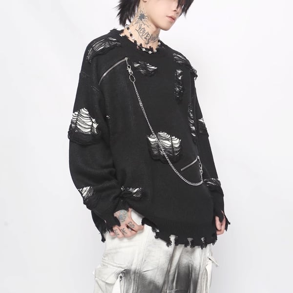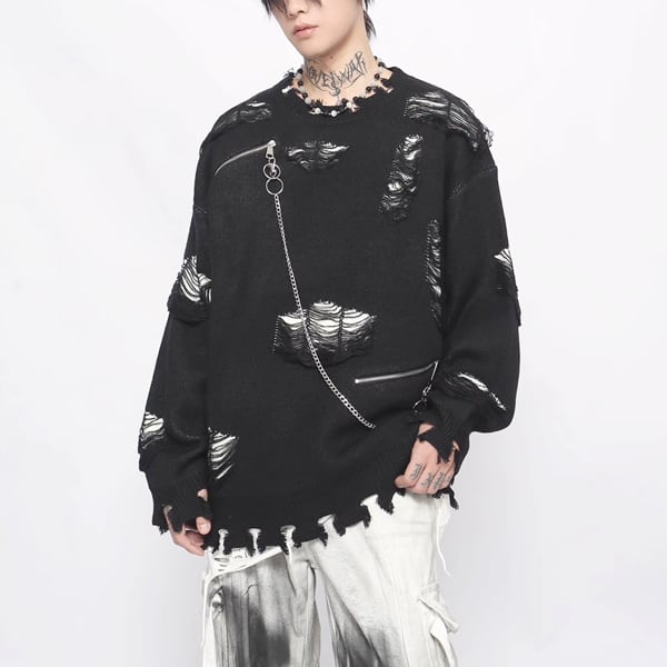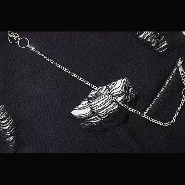 リングチェーンジッパーダメージグランジブラックニット(ruf_01639)
